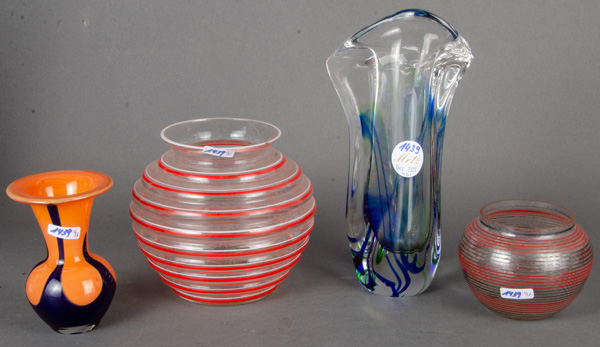 - Katalog-Nr: 1439Vier unterschiedliche Vasen, u.a. Böhmen / Murano 20. Jh. Farbloses Glas, teilw. farbig überfangen, teilw. mit Einschmelzungen; am Boden Ätzsignatur, H=8,5 bis 25 cm. (best.)o.L.
