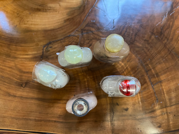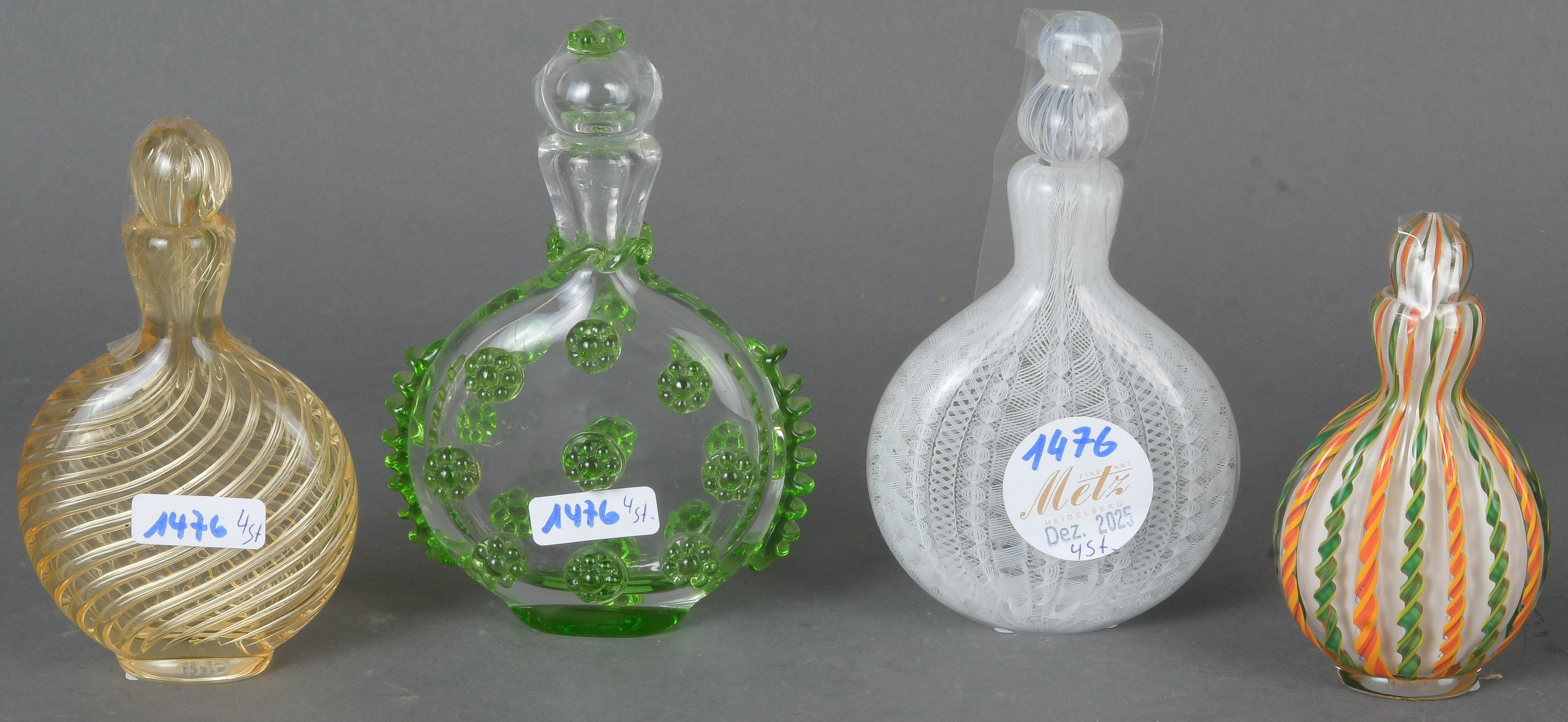- Katalog-Nr: 1476Vier Schnupftabakfläschchen. Bayerischer Wald um 1900 und später. Farbloses Glas mit Ein- bzw. Aufschmelzungen, H=9,5 bis 12,5 cm.o.L.