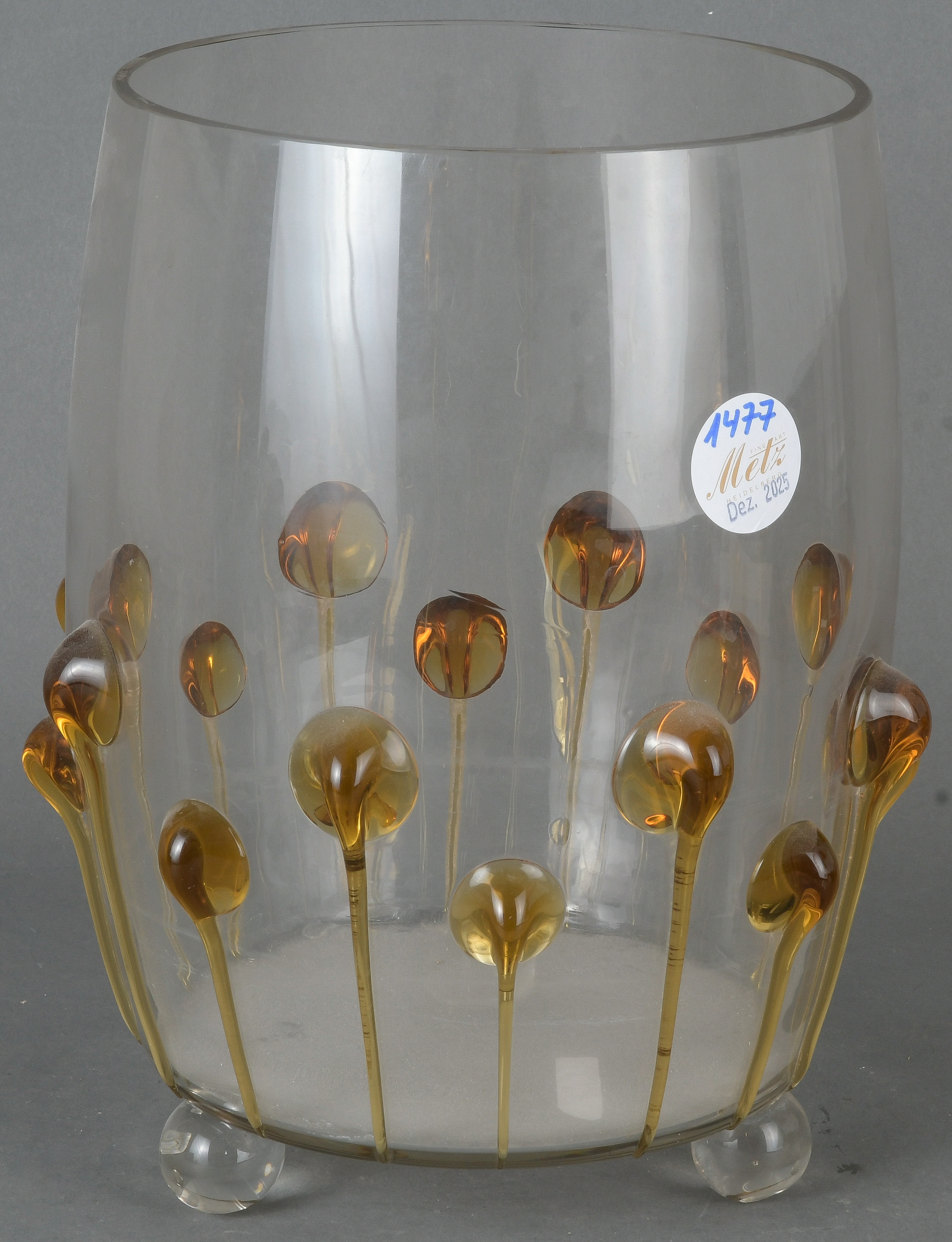 - Katalog-Nr: 1477Art Déco-Vase. Wien um 1920. Farbloses Glas mit aufgeschmolzenen Noppen auf drei Kugelfüßen, H=26 cm.o.L.