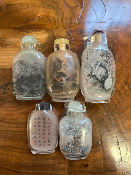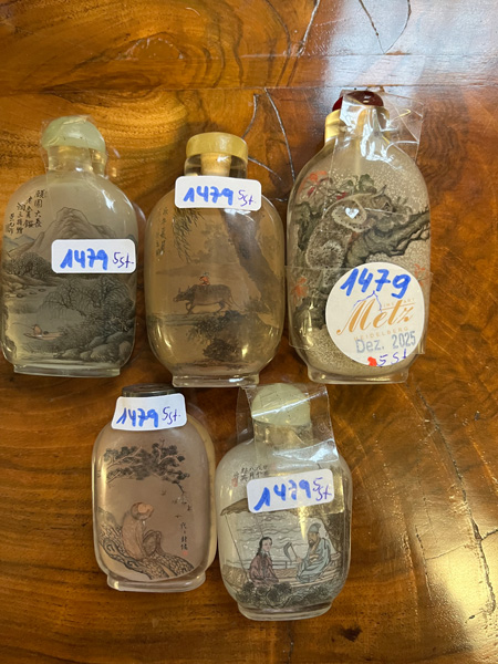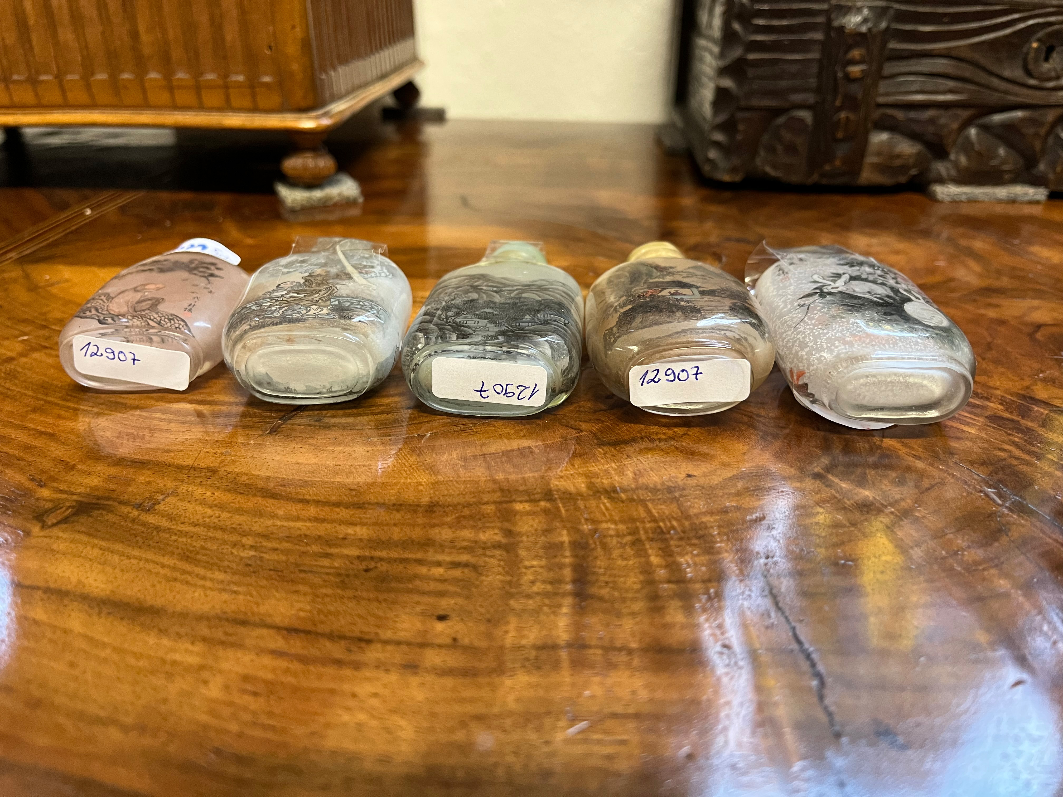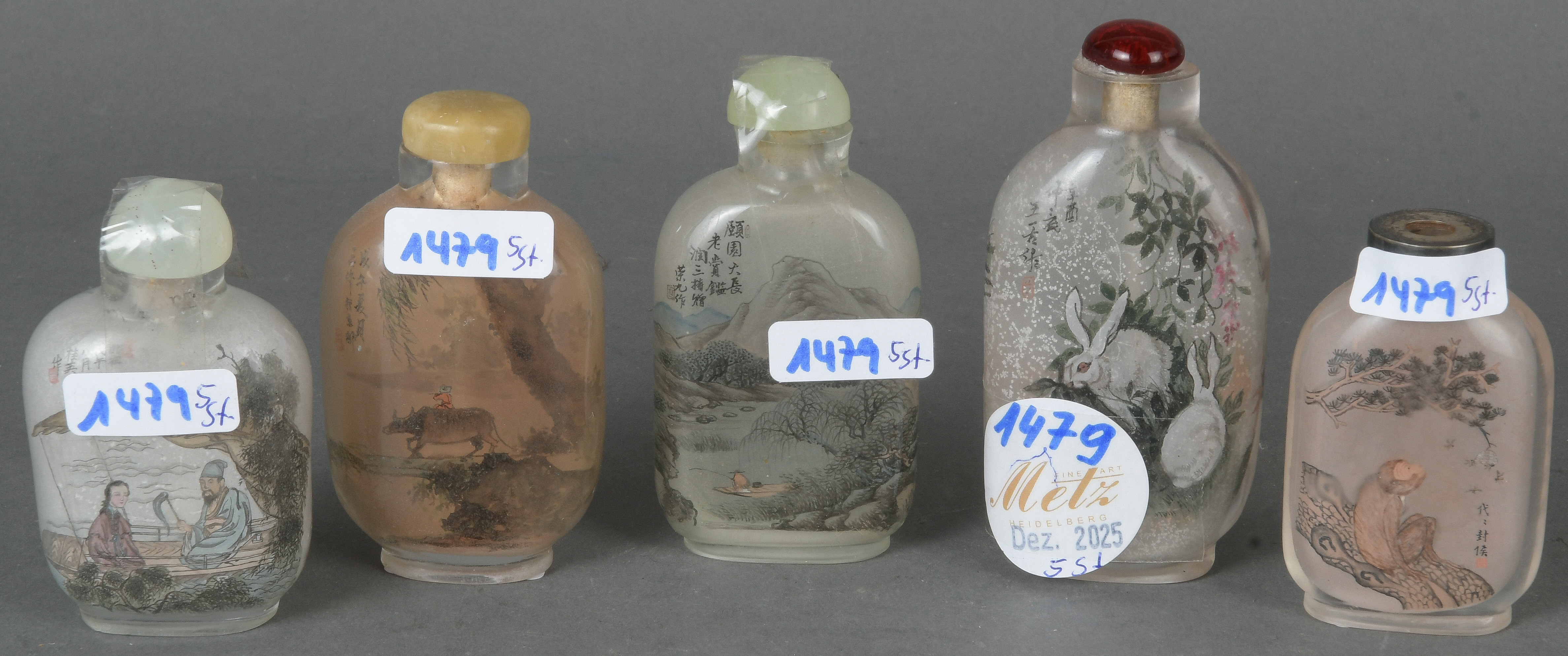- Katalog-Nr: 1479Fünf Snuffbottles. Asien. Glas mit unterschiedlichen Szenen und Beschriftungen, H=6,2 bis 8,6 cm. (ein Stöpsel fehlt)o.L.