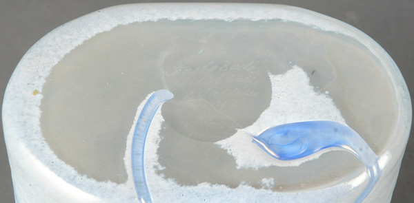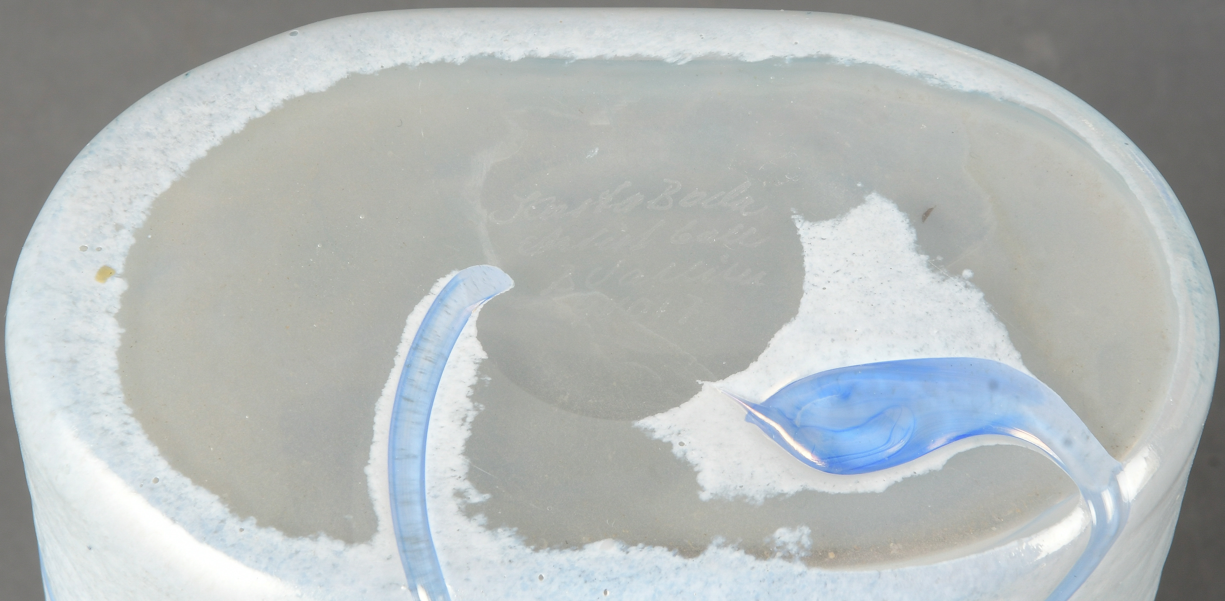 - Katalog-Nr: 1480Zwei Vasen. Schweden, Kosta Boda 20. Jh. Farbloses Glas, farbig überfangen mit Aderaufschmelzungen, Entwurf und sign. Bertil Vallien, H=14,7 / 28 cm.o.L.