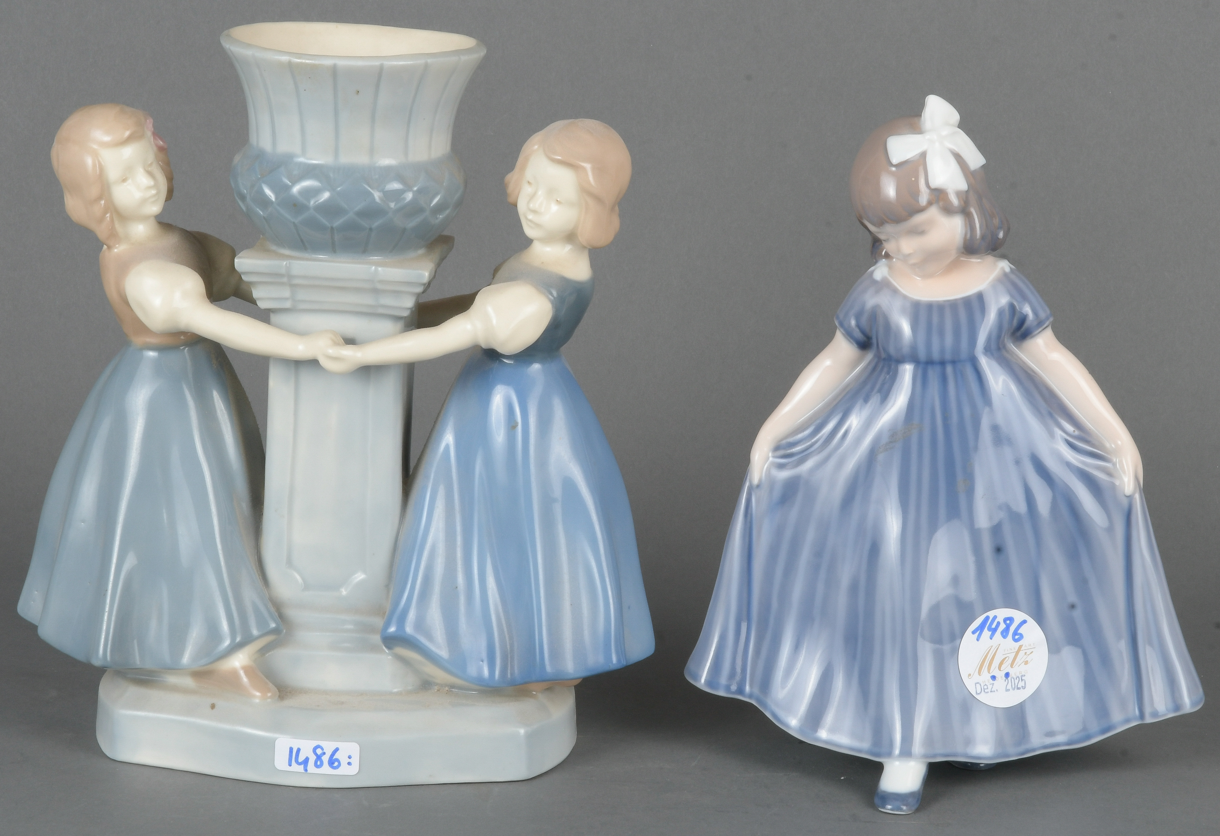 - Katalog-Nr: 1486Tänzerin und Mädchen mit Vase, u.a. Royal Copenhagen 20. Jh. Porzellan, bunt bemalt; am Boden gemarkt, mit Ziffer „2444“, Entwurf und verso monogr. „VW“ für Vilhelm Waldorff, H=21 / 22 cmo.L.