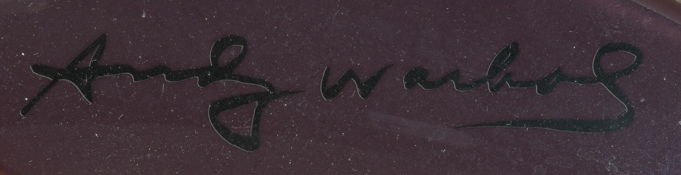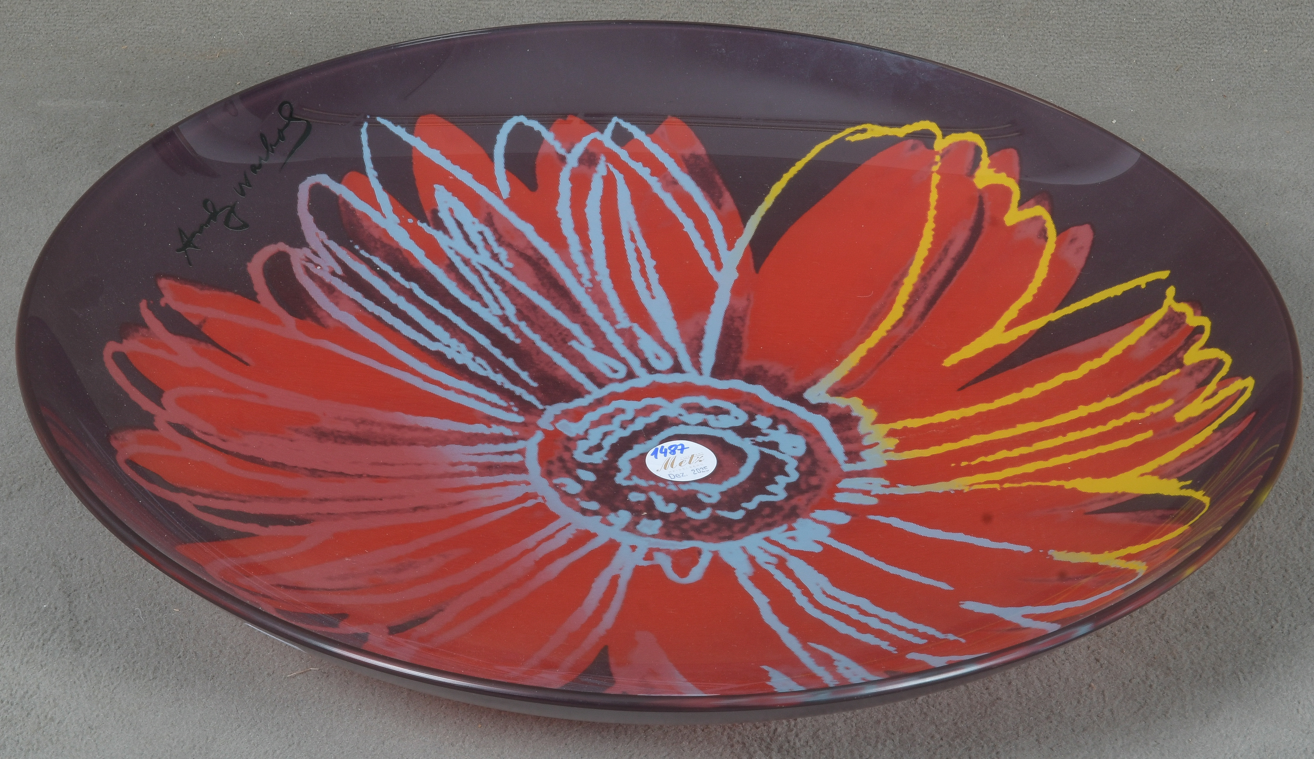 - Katalog-Nr: 1487Große, runde Platte. Rosenthal 20. Jh. Farbloses Glas, farbig überfangen; verso gemarkt, Entwurf und sign. Andy Warhol, D=52,8 cm.o.L.