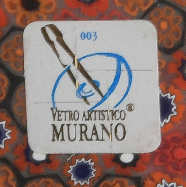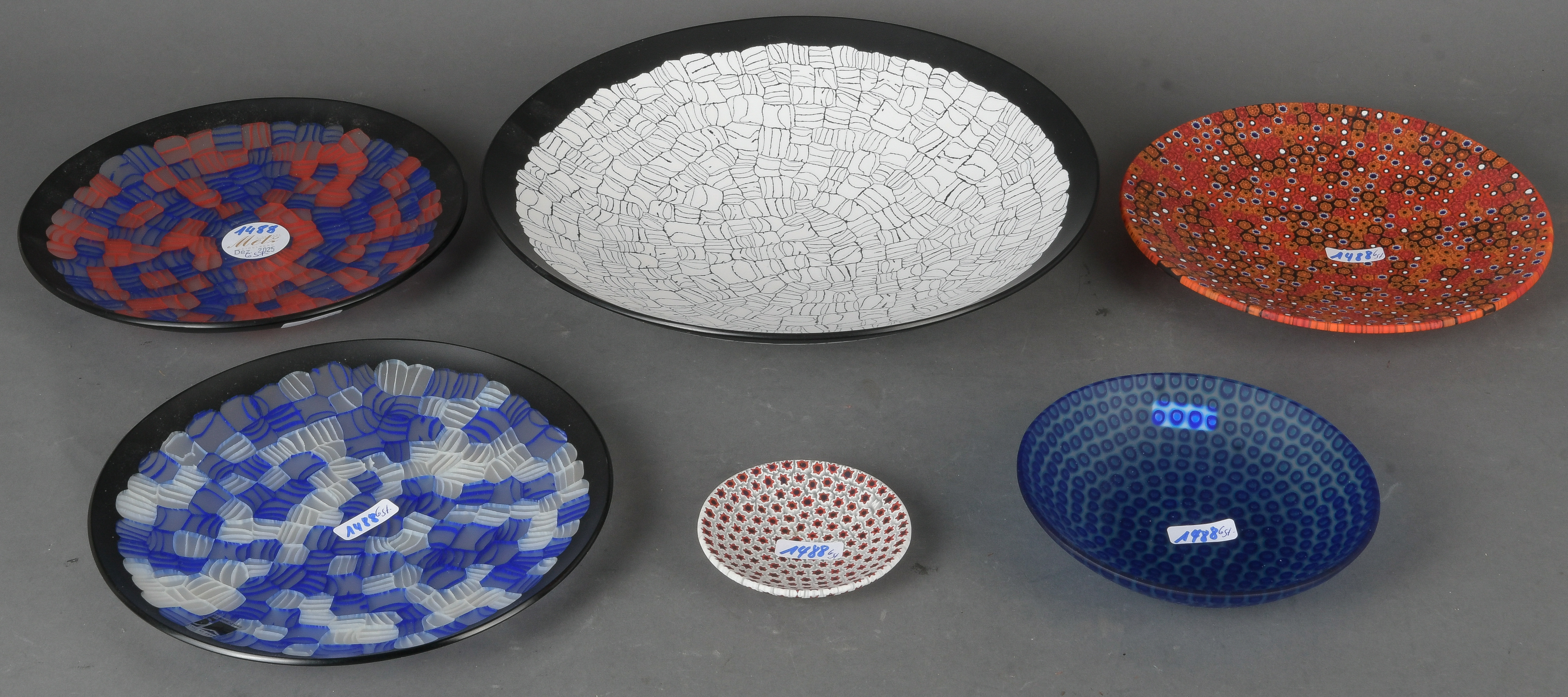 - Katalog-Nr: 1488Fünftlgs. Konvolut Murano 20. Jh. Farbloses Glas, farbig überfangen, teilw. mit Millefiori-Einschmelzungen; dazu Keramikplatte, D=7,9 bis 27 cm.o.L.