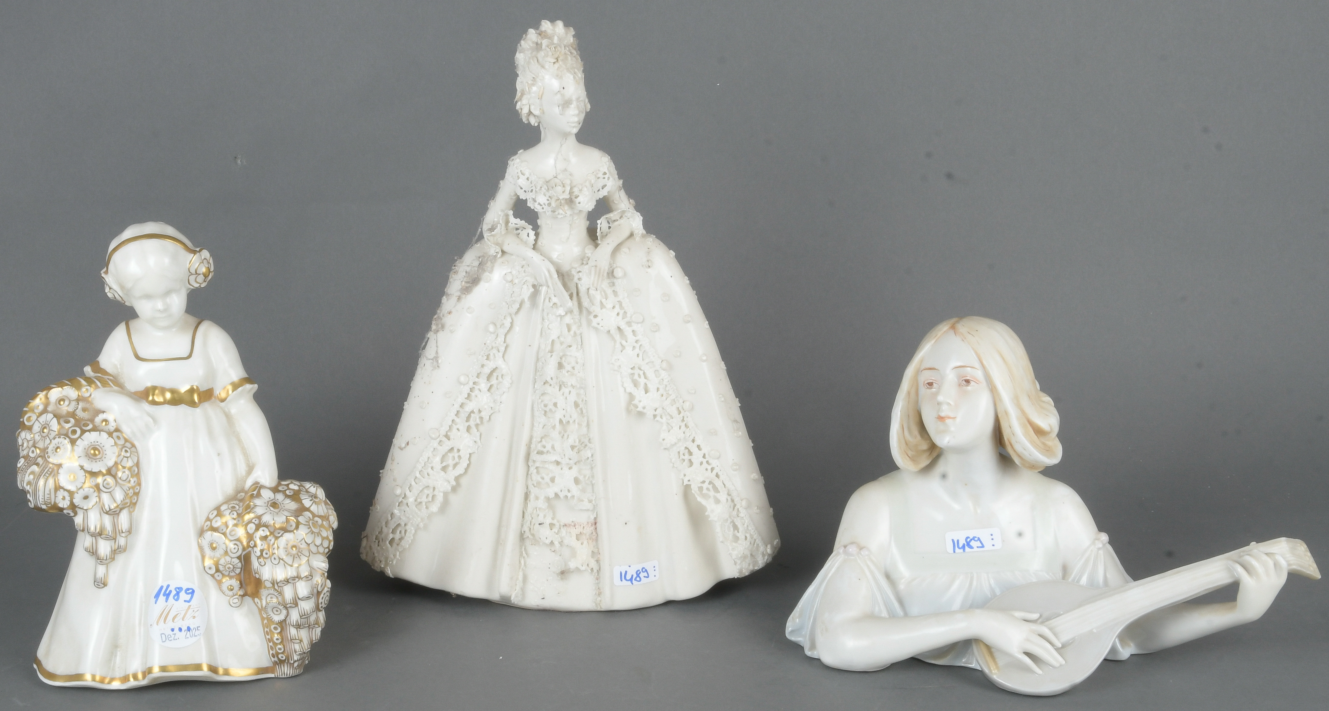 - Katalog-Nr: 1489Zwei Figuren und eine Büste, u.a. Pirkenhammer 20. Jh. Porzellan, bunt bemalt und gold gehöht, H=15,2 bis 29 cm. (teilw. besch.)o.L.