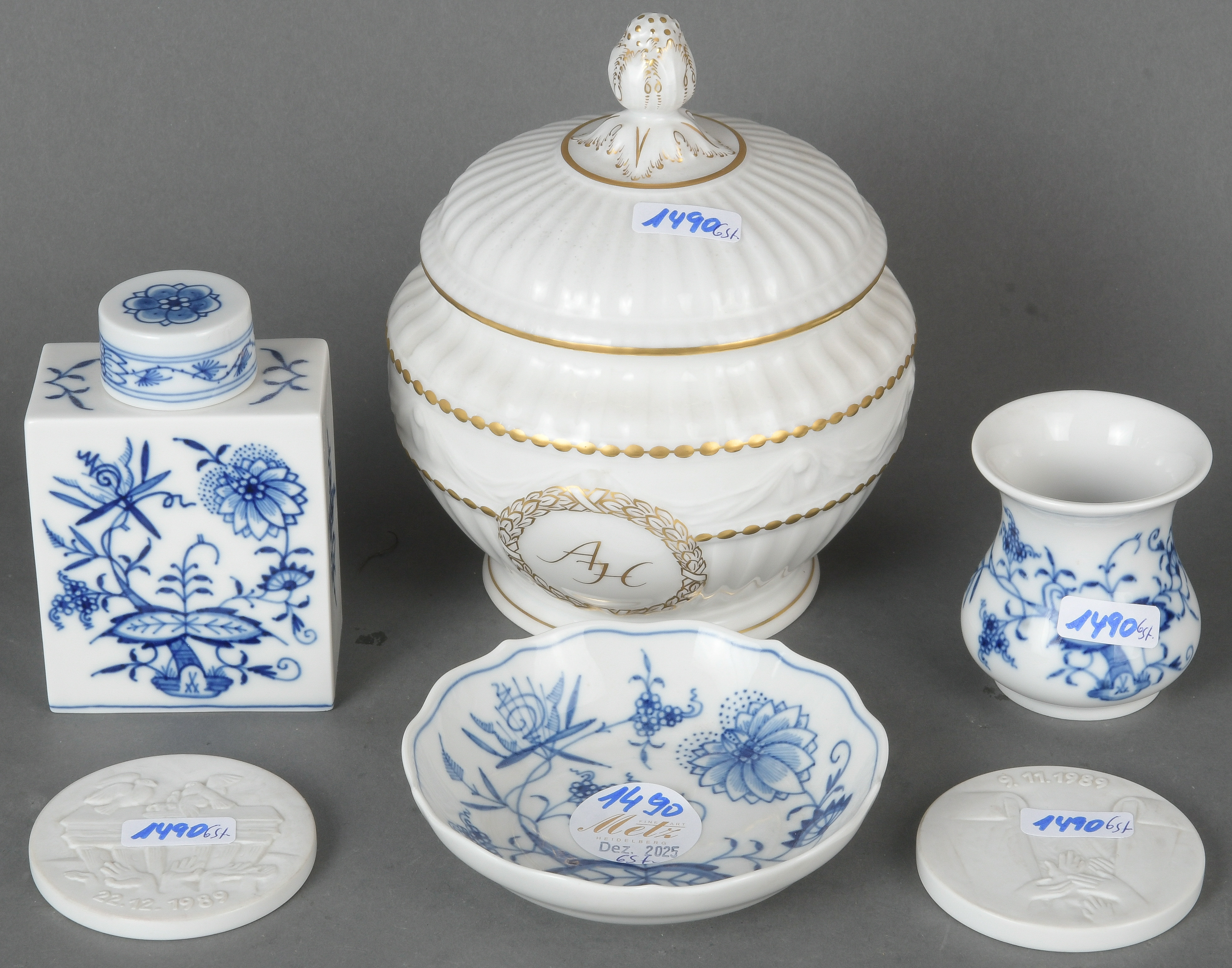 - Katalog-Nr: 1490Sechtlgs. Konvolut Berlin / Meissen 20. Jh. Porzellan, unterglasurblau bemalt, teilw. mit Zwiebelmuster; am Boden gemarkt. Bestehend aus: Eine Teedose (H=10 cm), eine Vase (H=6,4 cm), ein Schälchen (D=10,7 cm), zwei Bisquitplaketten (D=je 6,4 cm) und eine runde Deckeldose (H=16 cm, D=13 cm).o.L.