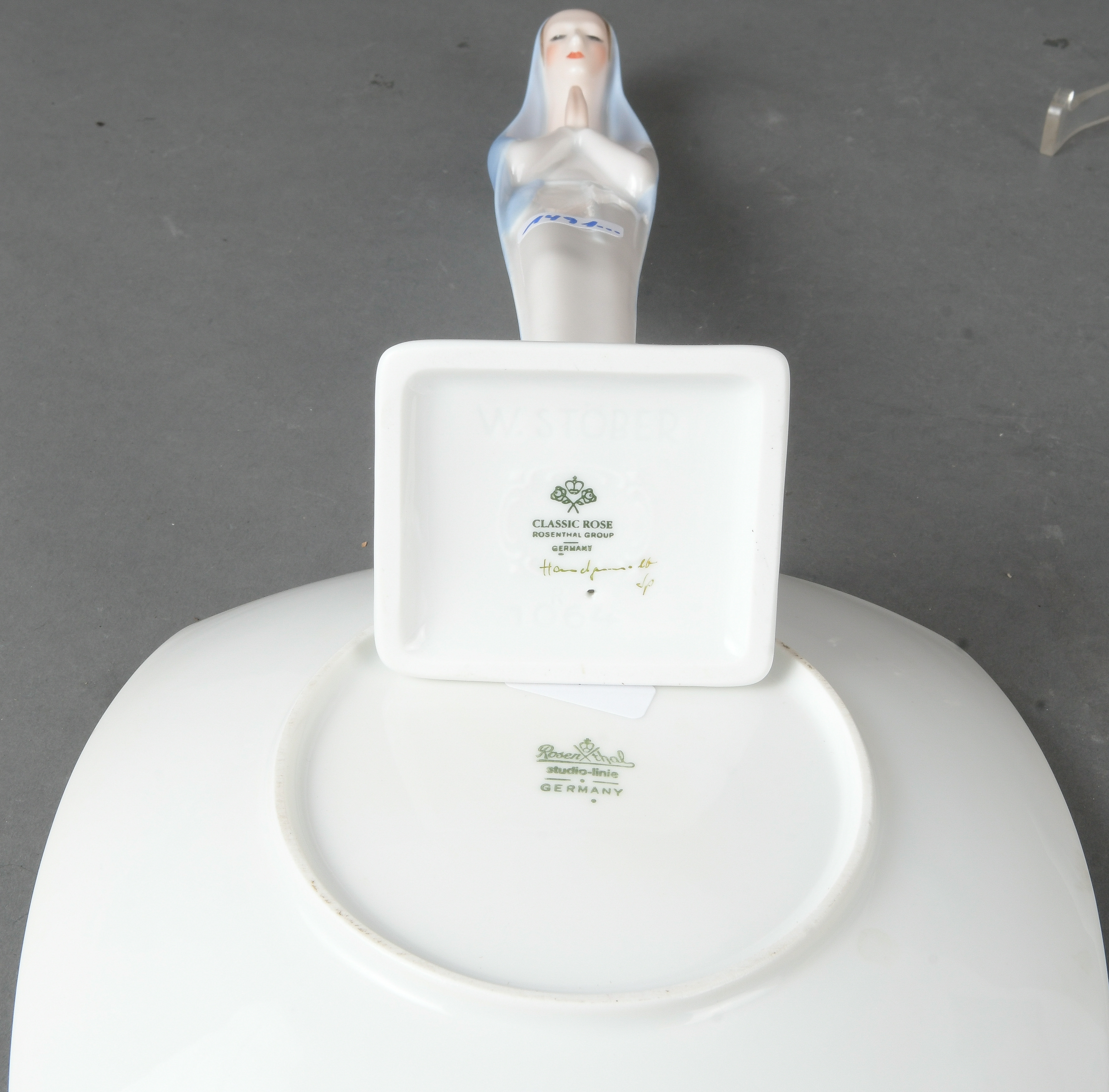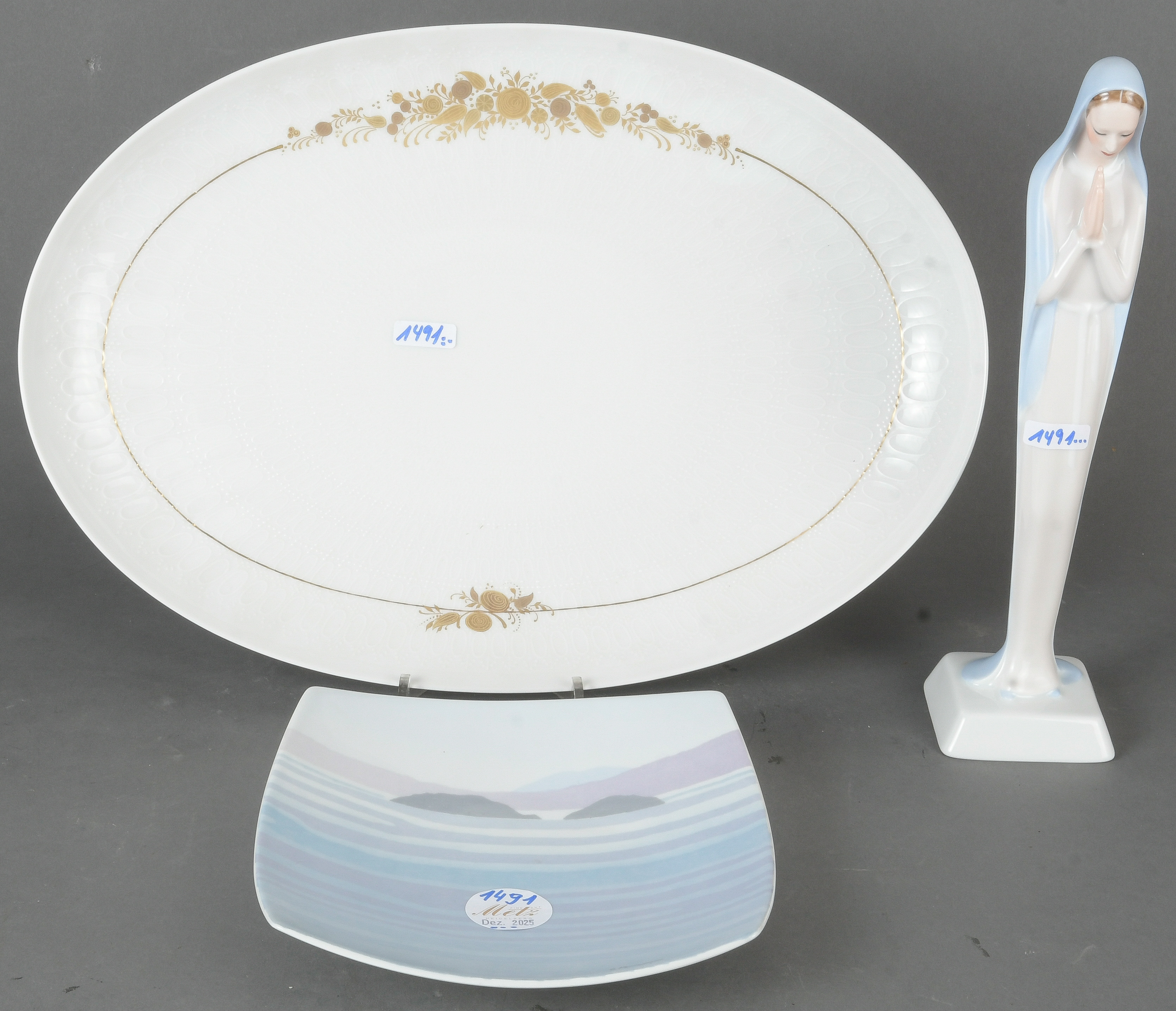 - Katalog-Nr: 1491Dreitlgs. Konvolut Rosenthal 20. Jh. Porzellan, bunt bemalt bzw. mit Reliefdekor; am Boden gemarkt, u.a. Entwurf von W. Stöber. Bestehend aus: Eine Muttergottes-Figur (H=28,5 cm), eine quadratische Schale (H=4 cm, 18 x 18 cm) und eine ovale Platte (H=4 cm, B=38,5 cm, T=26,5 cm).o.L.