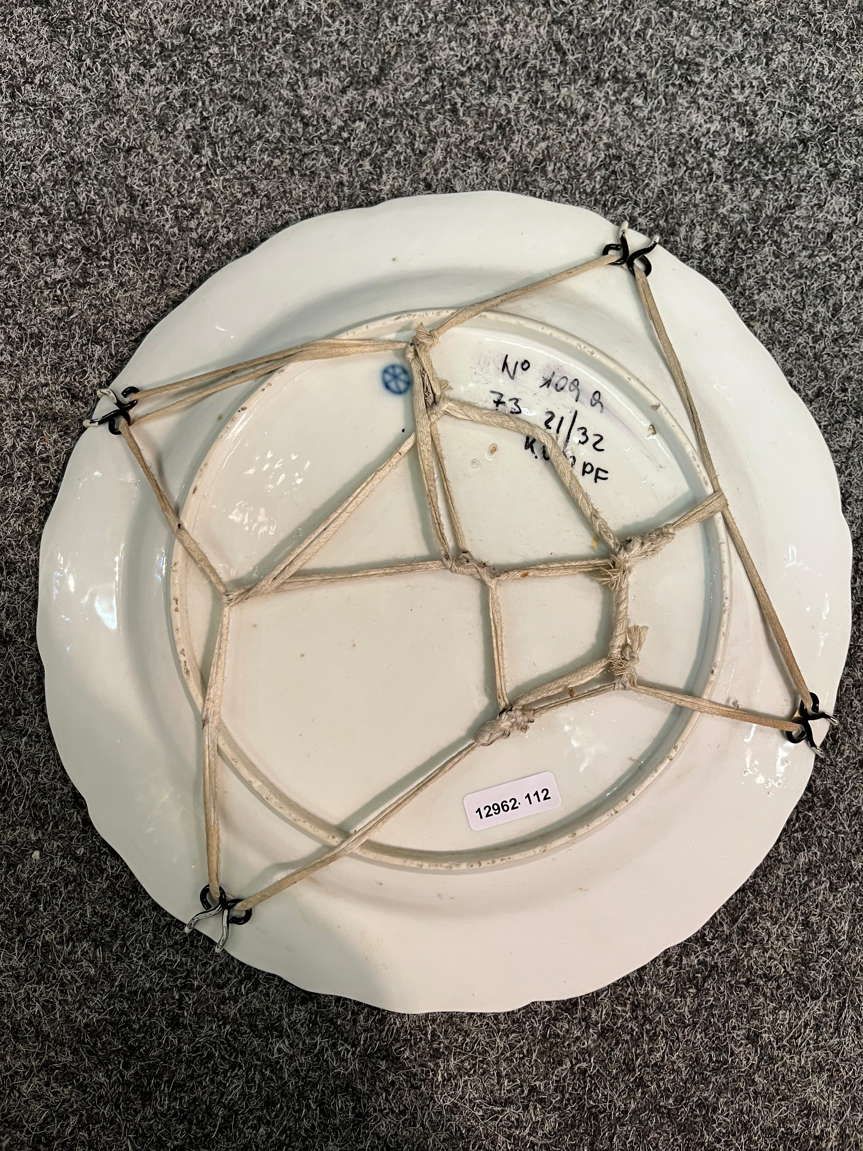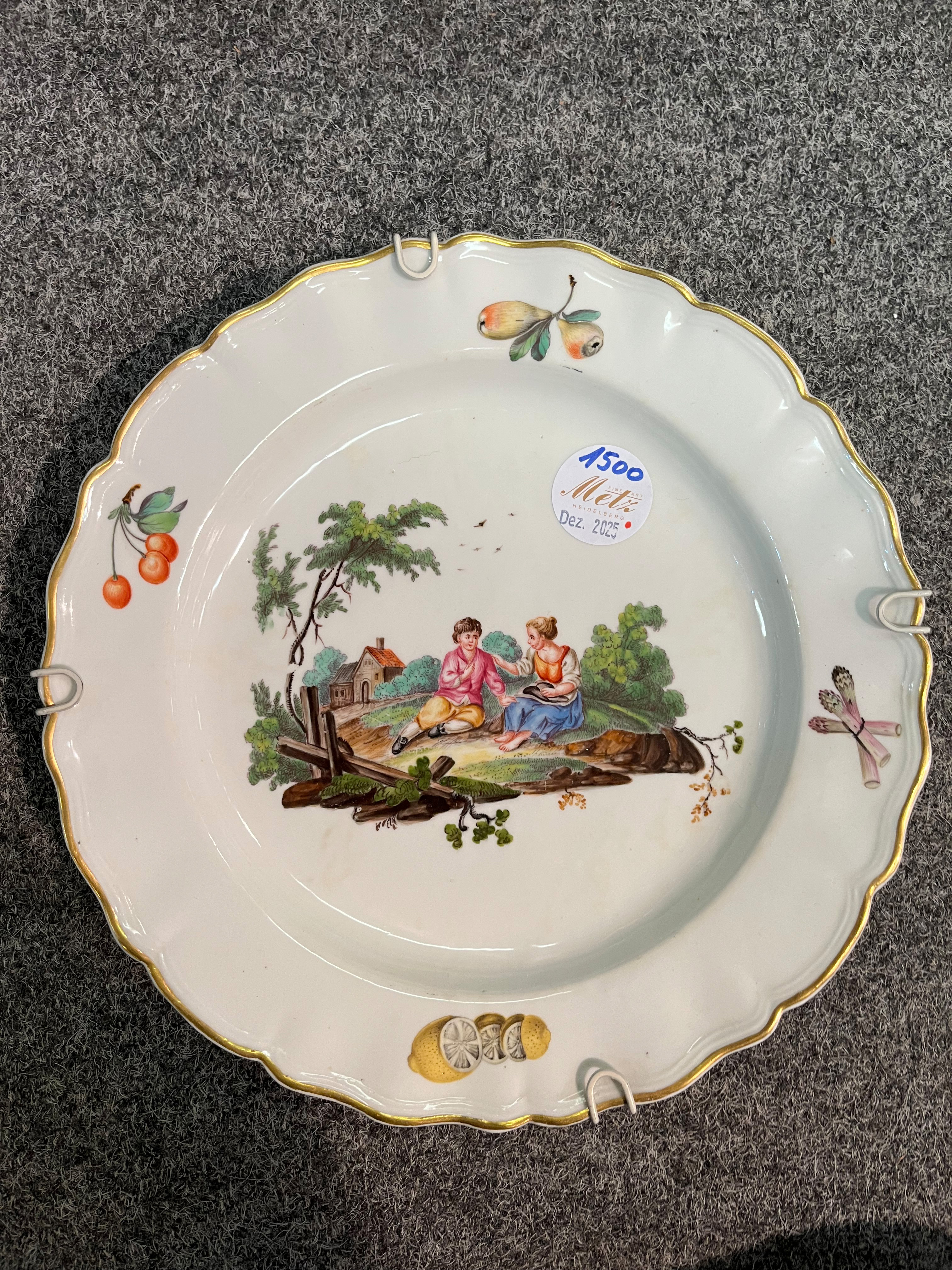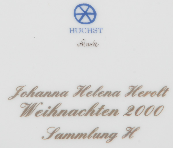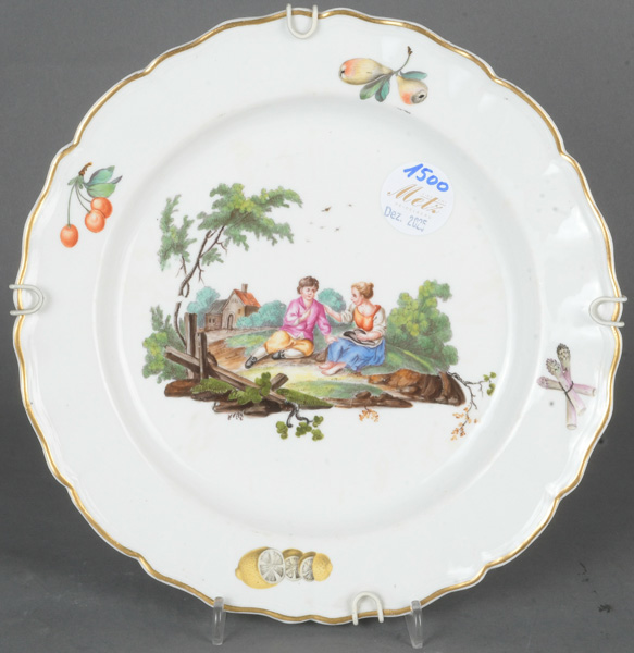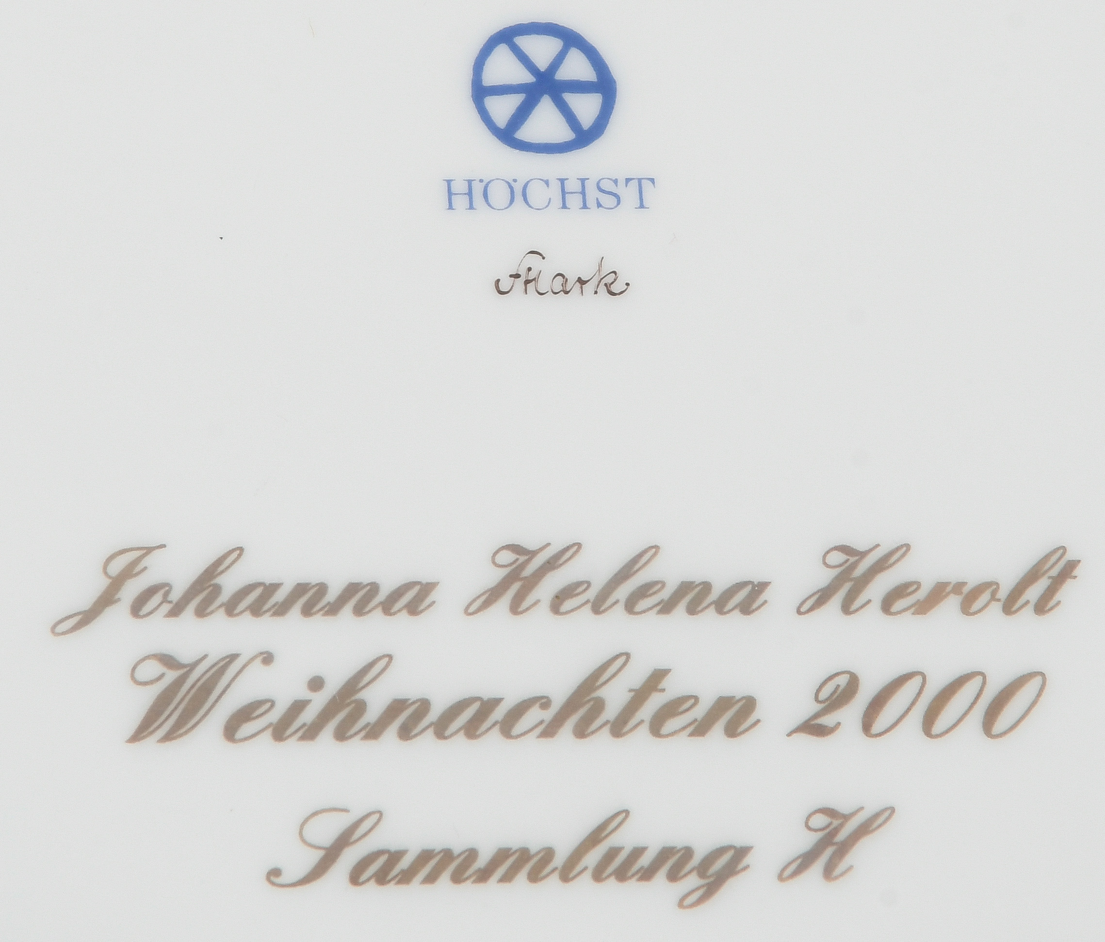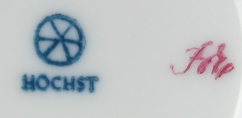 - Katalog-Nr: 1500Teller. Höchst 1770. Porzellan, bunt bemalt; verso unterglasurblaue Radmarke, D=24,5 cm. Provenienz: Sammlung Bruno Sandner, Hofheim.o.L.