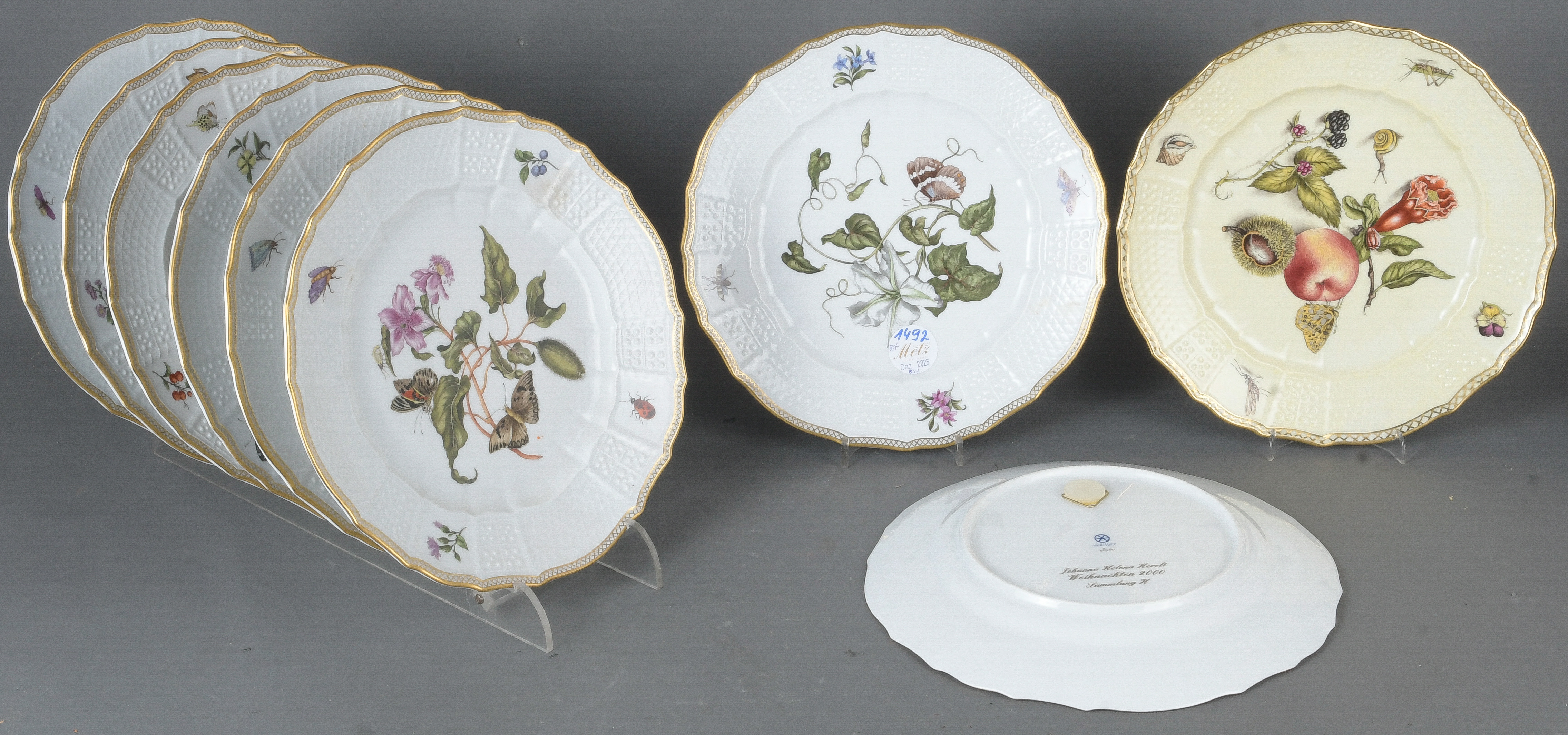 - Katalog-Nr: 1492Acht Speiseteller „Neubrandensteinrelief“. Höchst 20. Jh. Porzellan, bunt bemalt mit Floraldekor, umgeben von Insekten; verso unterglasurblaue Radmarke, D=je 25,5 cm.o.L.