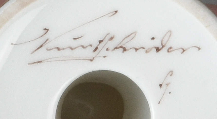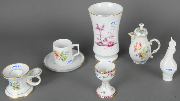 - Katalog-Nr: 1493Sechstlgs. Konvolut Höchst / Meissen 20. Jh. Porzellan, purpurn bzw. bunt bemalt; am Boden gemarkt. Bestehend aus: Ein Eierbecher (H=7,3 cm), ein Flakon (H=11,5 cm), eine Kanne (H=11,2 cm), ein Nachtlicht (H=5,8 cm), eine Tasse mit Unterschale und eine Vase (H=15 cm). Provenienz: Sammlung Bruno Sandner, Hofheim.o.L.