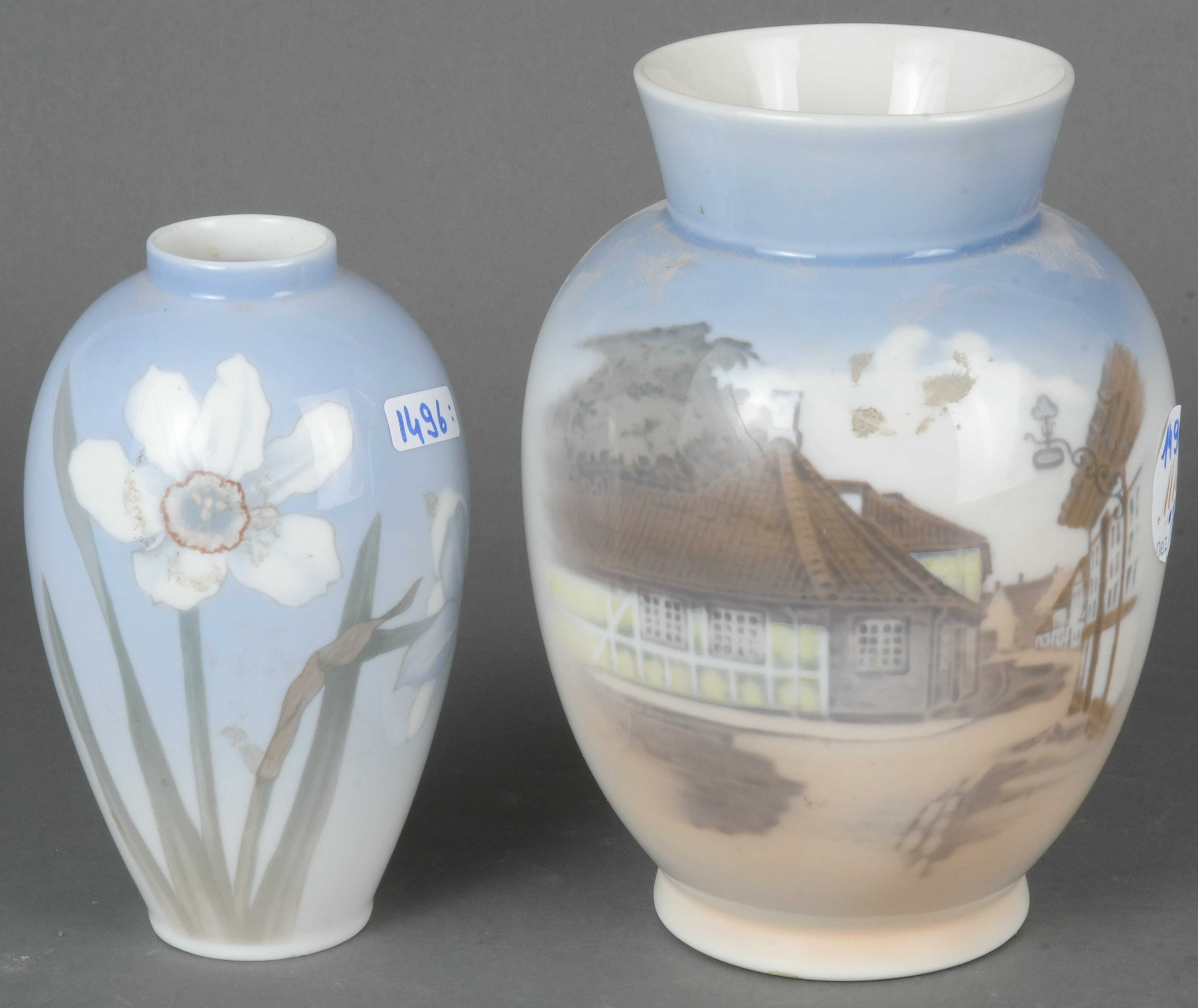 - Katalog-Nr: 1496Zwei Vasen. Royal Copenhagen 20. Jh. Porzellan, bunt bemalt mit Fachwerkgebäude / Osterglocke; am Boden gemarkt, mit Ziffer „4764“ / „108/47B“, H=14 / 17,2 cm.o.L.