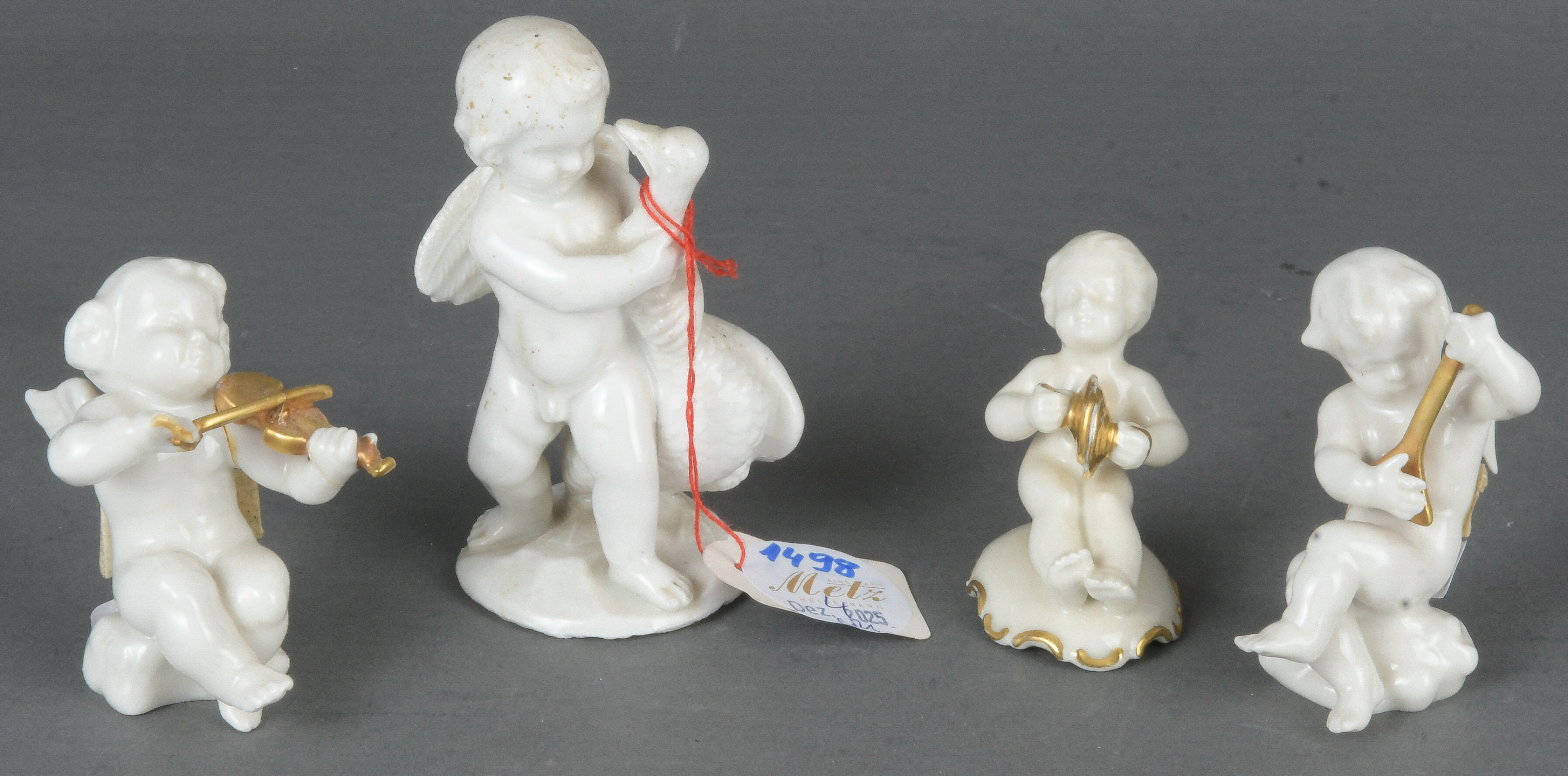 - Katalog-Nr: 1498Putto mit Schwan und drei musizierende Putten, u.a. Hutschenreuther 20. Jh. Porzellan, weiß glasiert, teilw. gold staffiert; am Boden gemarkt, Entwurf u.a. Karl Tutter, H=6 bis 10 cm. (teilw. besch.)o.L.