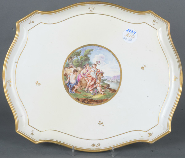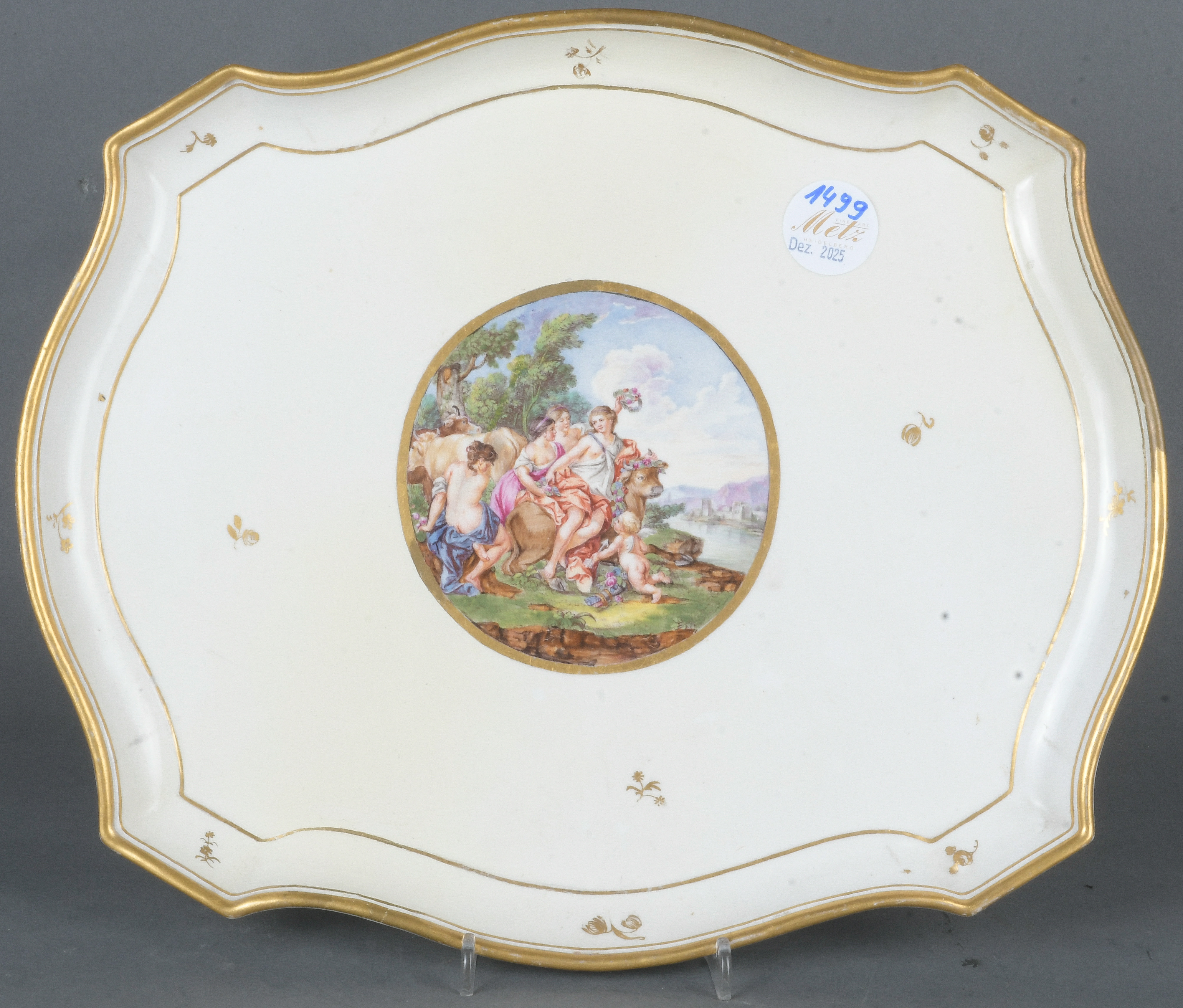 - Katalog-Nr: 1499Solitärtablett. Höchst 1775-80. Porzellan, fein bunt bemalt mit Europa auf dem Stier; verso unterglasurblaue Schwertermarke, H=3 cm, B=35,5 cm, T=29,5 cm. Provenienz: Sammlung Bruno Sandner, Hofheim. (rest.)o.L.