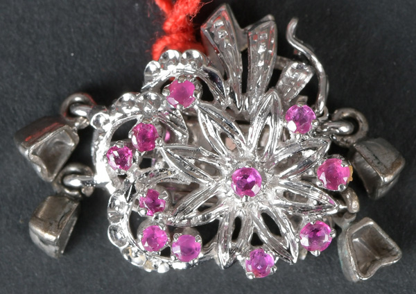 - Katalog-Nr: 1483Verschluss einer Perlenkette. 18 kt Gold, besetzt mit Rubinen, Gesamtgewicht ca. 5,41 g.o.L.