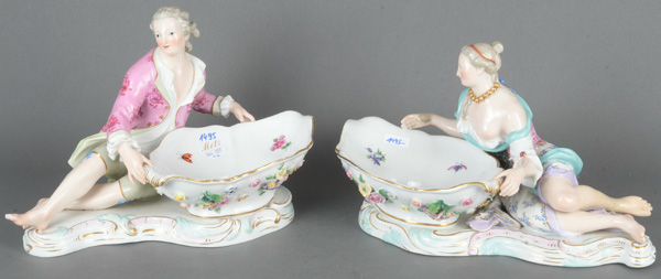 - Katalog-Nr: 1495Paar Gewürzschalen. Meissen 19. Jh. Porzellan, bunt bemalt Floraldekor, Goldrand; am Boden unterglasurblaue Schwertermarke mit Schleifstrich, Modell nach Johann Joachim Kaendler, H=je 20 cm. (min. best. / min. rest.)o.L.
