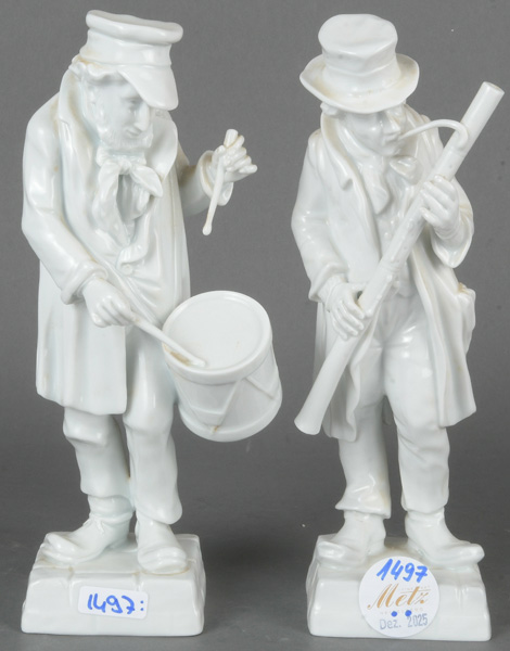 - Katalog-Nr: 1497Fagottspieler und Trommler. Dresden 20. Jh. Porzellan, weiß glasiert; am Boden gemarkt, H=22,7 / 23 cm.o.L.