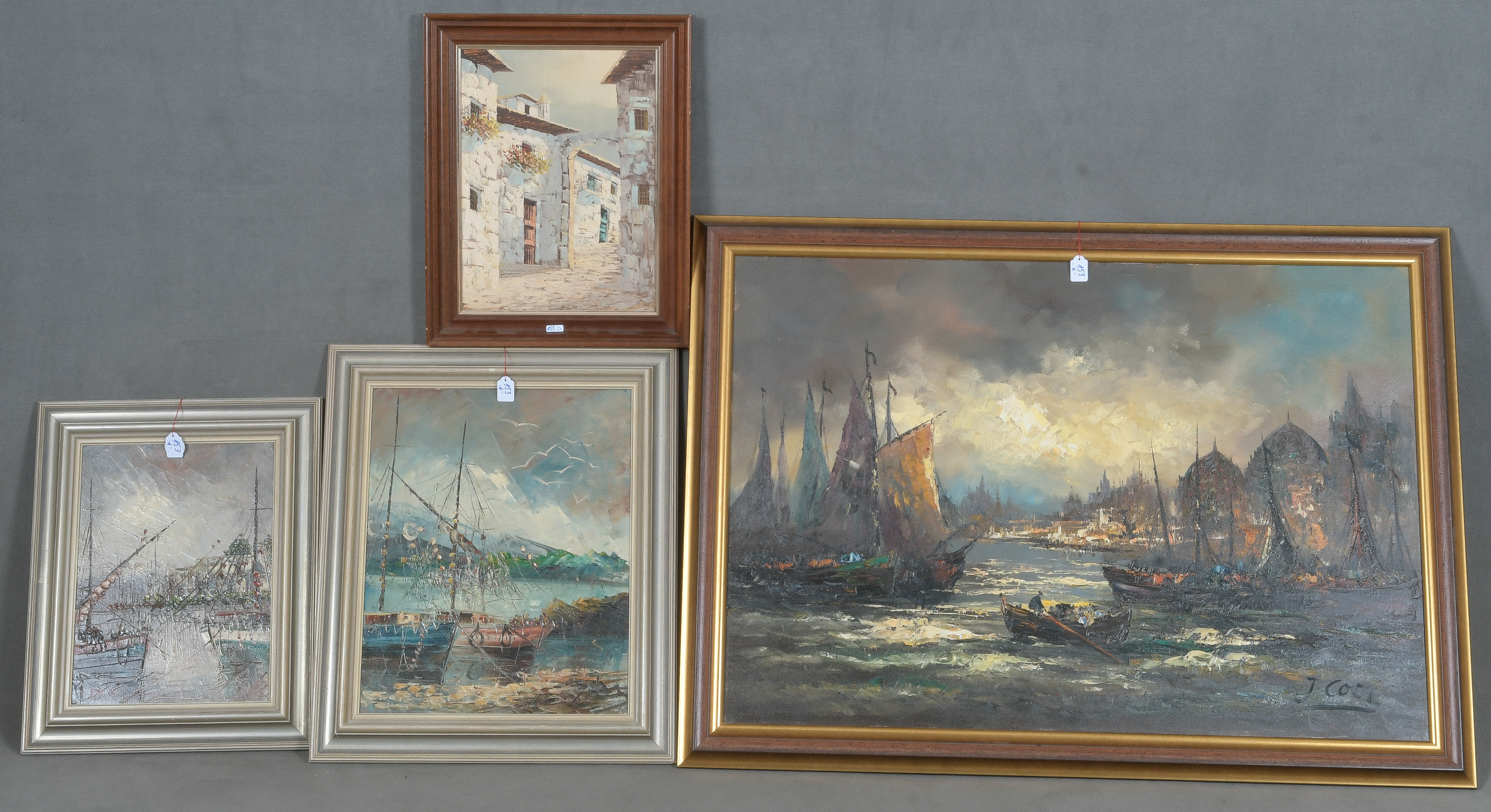 - Katalog-Nr: 153Maler des 20. Jhs. Segelboote an der Mole und Stadtansicht. Öl/Lw., re./u. unleserlich sign., gerahmt, 30 x 40 bis 69 x 110 cm.o.L.