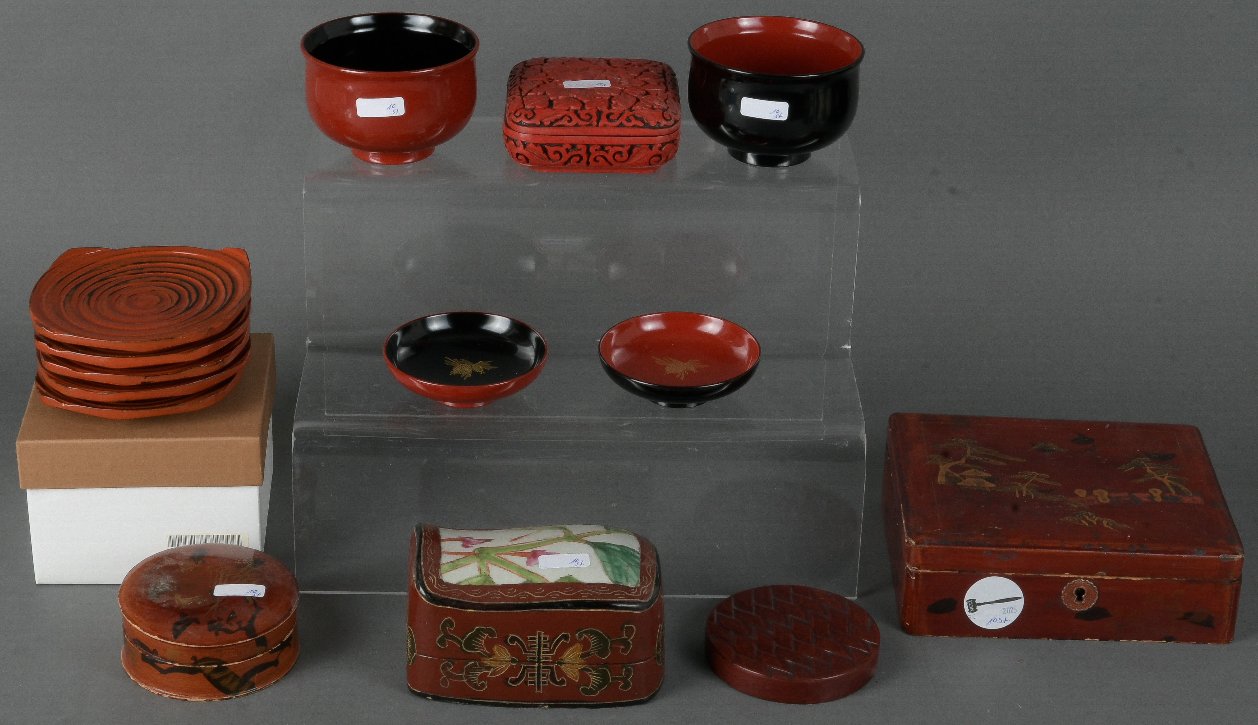 - Katalog-Nr: 16314-tlgs. Konvolut Asiatika aus Massivholz mit Lackdekor. Bestehend aus: Vier Schatullen, Reisschalen und Untersetzer.o.L.