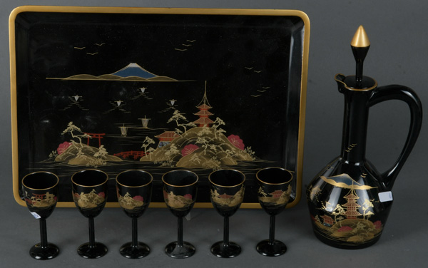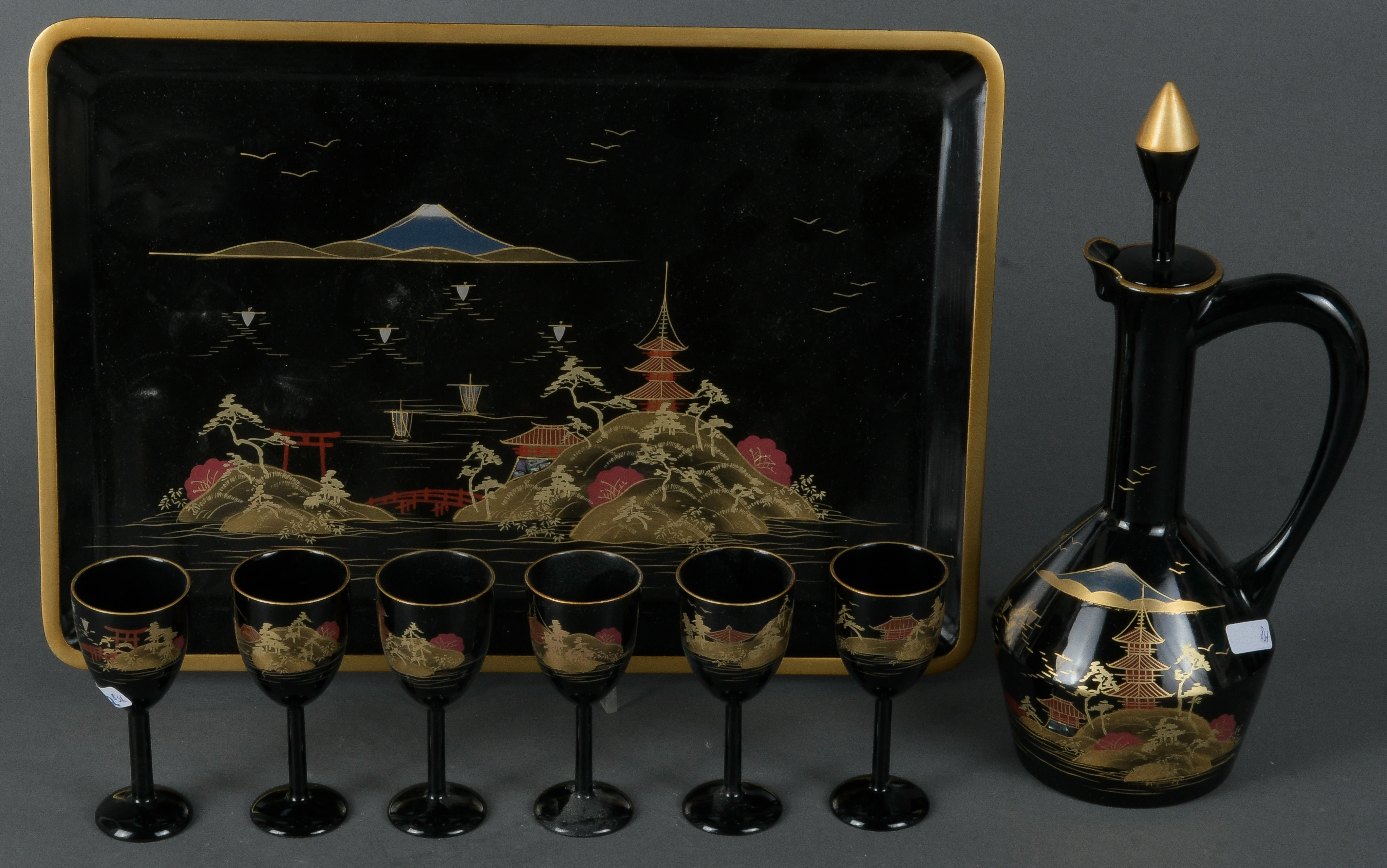 - Katalog-Nr: 164Achttlgs. Likörset. Asien. Pappmaché, beidseitig schwarz gelackt, Schauseiten bunt bemalt. Bestehend aus: Eine Karaffe (H=26 cm), sechs kleine Kelche (H=je 9 cm) und ein rechteckiges Tablett (H=2 cm, B=33,5 cm, T=23,5 cm).o.L.