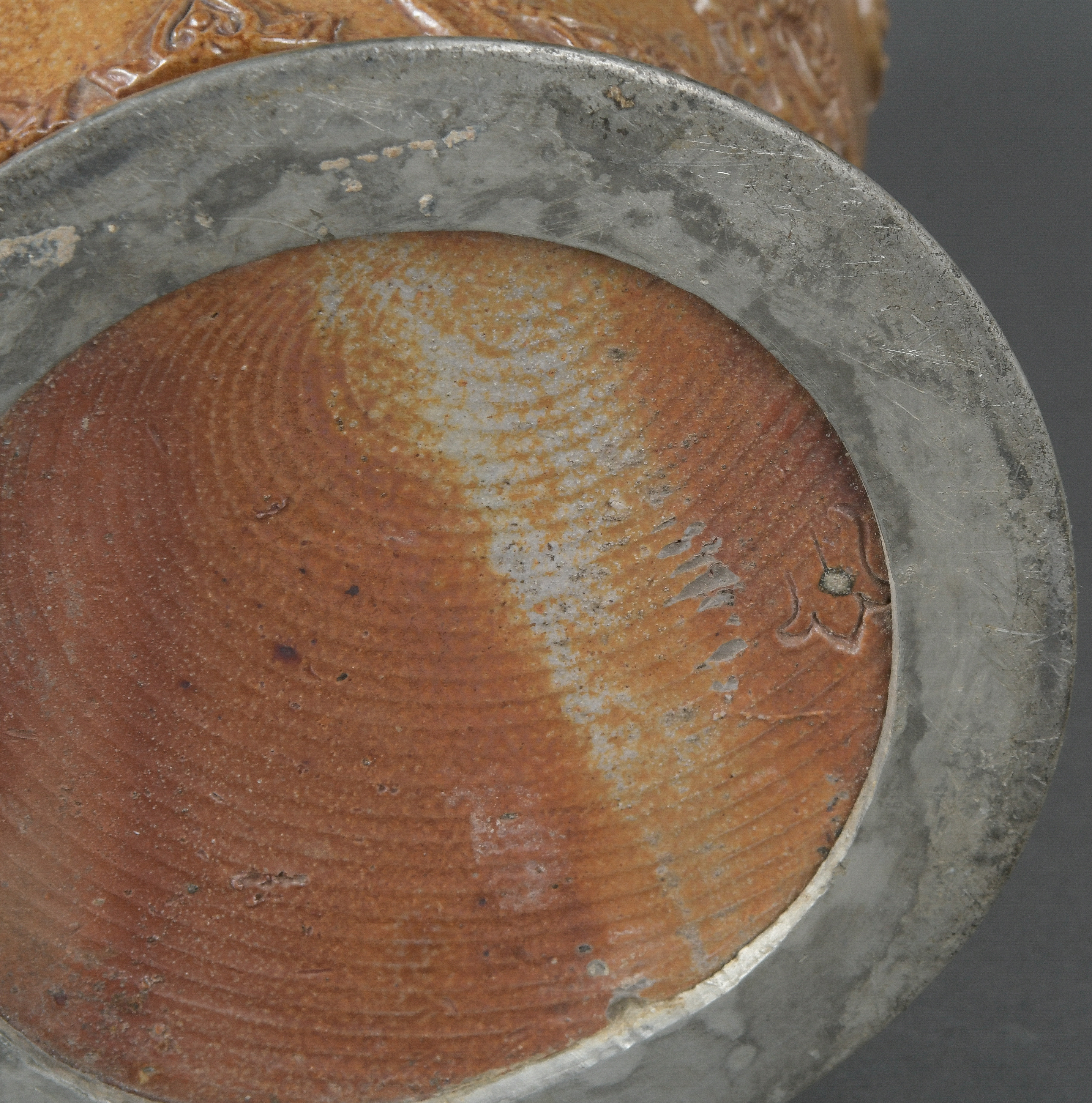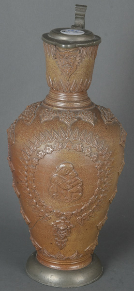 - Katalog-Nr: 167Henkelkanne. Rheinland 19. Jh. Braunes, salzglasiertes Steinzeug mit Ritzreliefdekor, Zinnstandring, -montur und -deckel, H=38 cm. (besch.)o.L.
