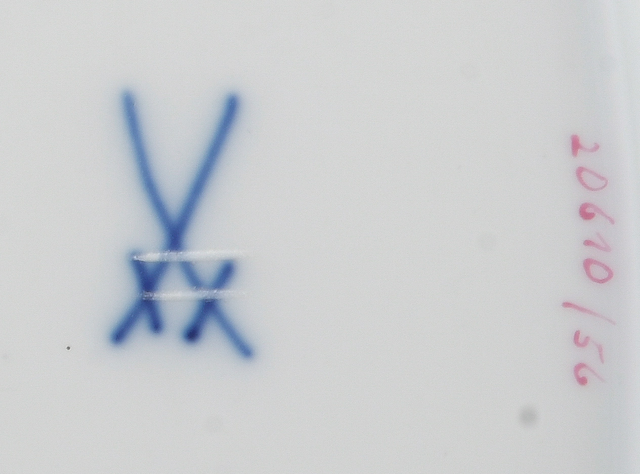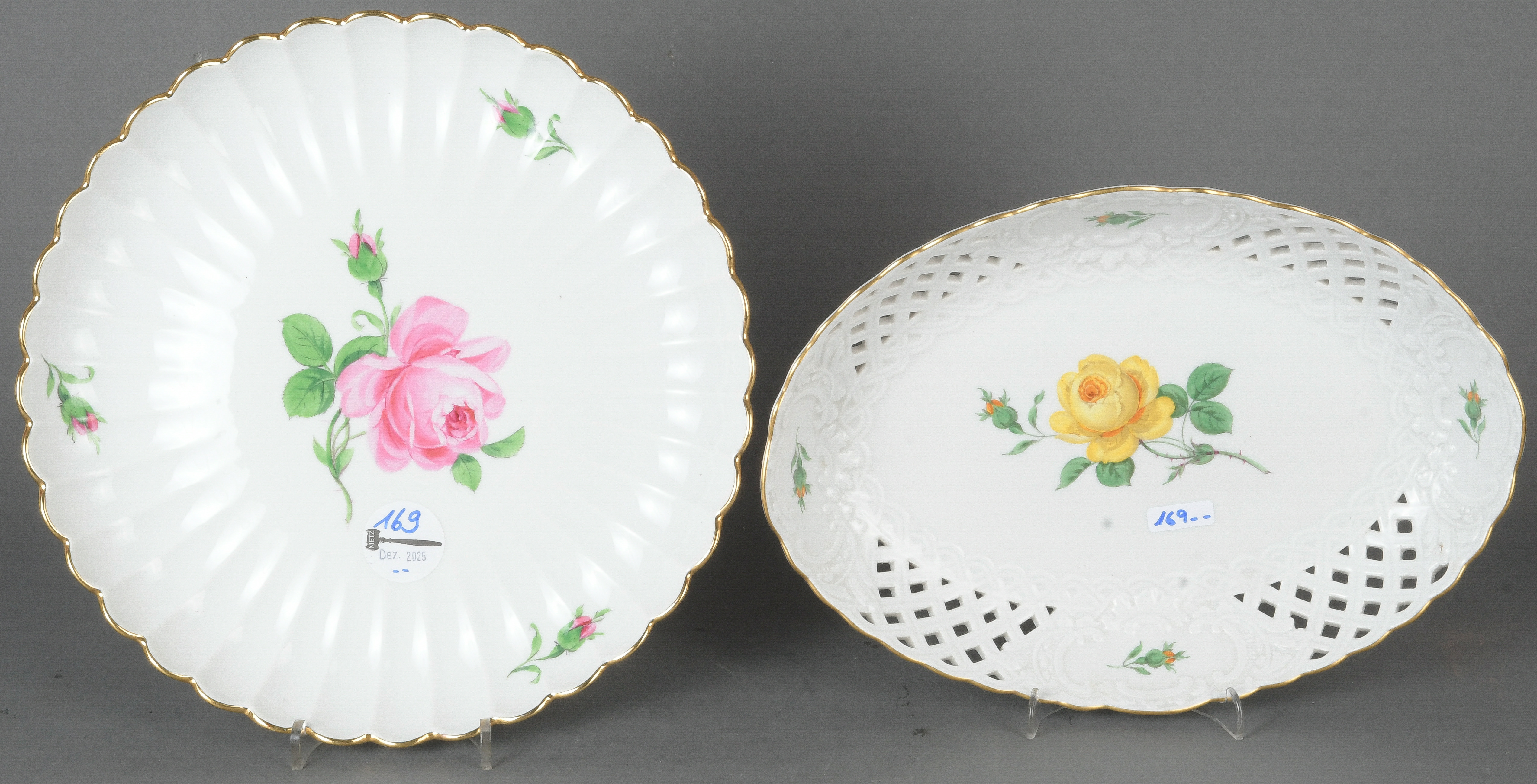 - Katalog-Nr: 169Zwei Schalen „Rote Rose“ / „Gelbe Rose“. Meissen Pfeifferzeit 1924–34 und später. Porzellan, bunt bemalt, Goldrand; verso unterglasurblaue Schwertermarke mit zwei Schleifstrichen, H=5 cm, B=28 cm, T=20,5 cm / D=27,5 cm.o.L.