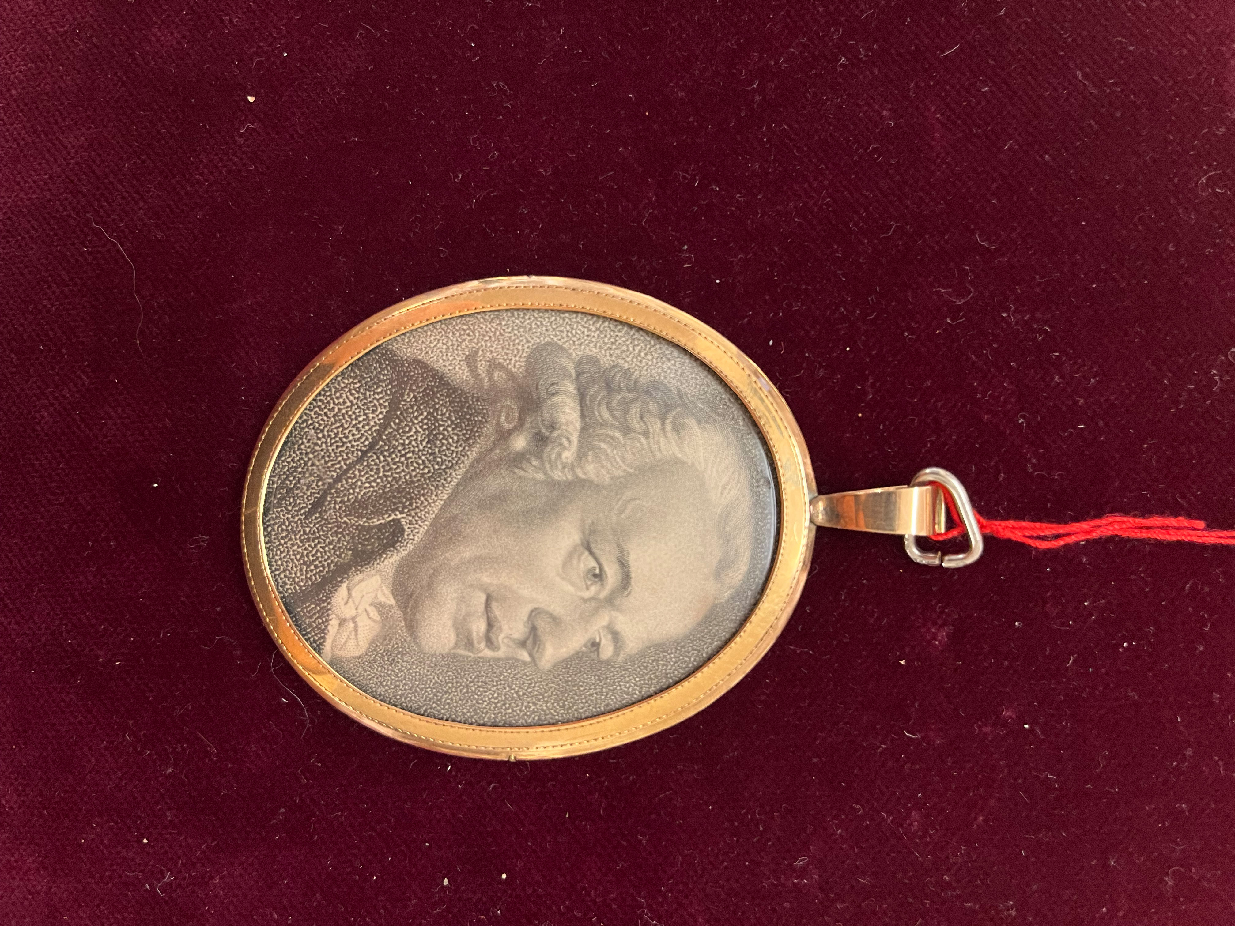- Katalog-Nr: 170Miniaturist des 19. Jhs. Zwei Herrenporträts. Papier, beidseitig bemalt, hi./Gl. in Goldrahmen, 6,2 x 5,3 cm.o.L.