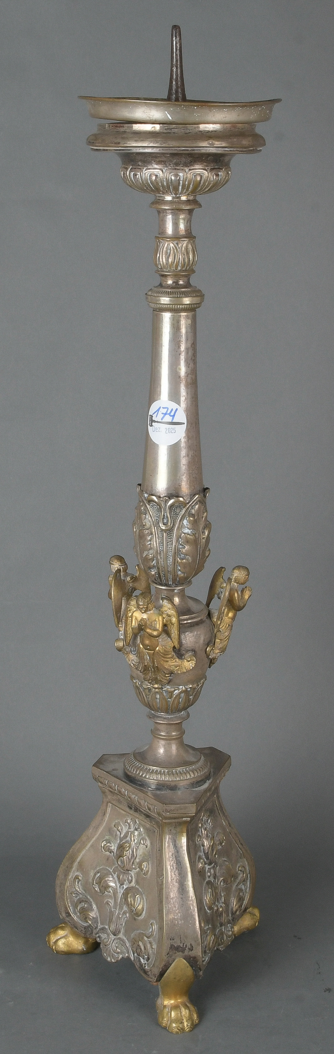 - Katalog-Nr: 174Bodenleuchter. Deutsch 18./19. Jh. Versilbert, mit Reliefdekor, H=62 cm.o.L.
