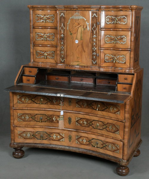 - Katalog-Nr: 155Tabernakelsekretär. Erfurt 1730-40. Nussbaum und Pflaumenholz furniert, marketiert mit Bandelwerk, Blüten, Rocaillen, musizierenden Figuren in Baldachin, teilw. gefärbt und schattiert, mit Zinneinlagen, fein ziselierte Messingbeschläge; Kugelfüße, profilierter Sockel, gebogenes, dreischübiges Unterteil mit Schreibklappe, Aufsatz mit Tabernakeltür, flankiert von je drei Schüben mit Zentralverriegelung, H=155 cm, B=121 cm, T=62 cm.o.L.
