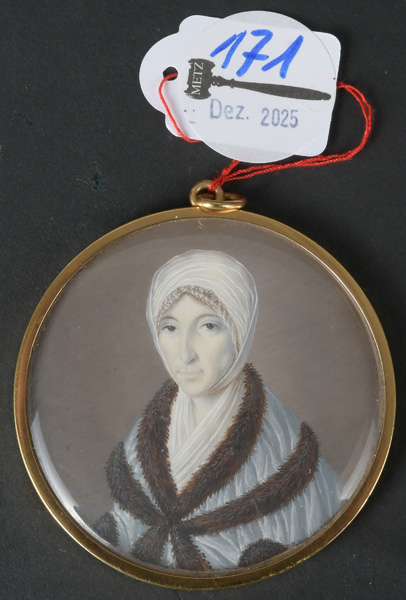 - Katalog-Nr: 171Miniaturist des 19. Jhs. Porträt einer Dame, hi./Gl. in Goldrahmen, D=7,2 cm.o.L.