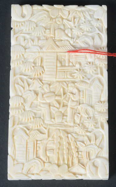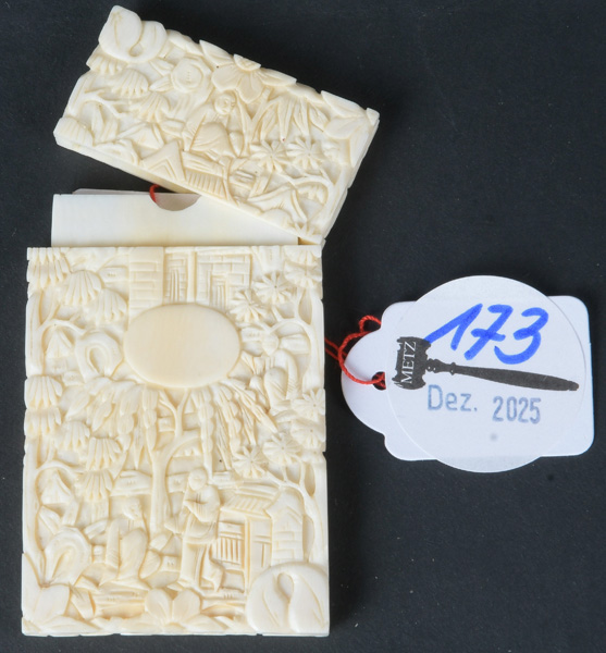 - Katalog-Nr: 173Rechteckiges Etui. Asien. Aufwendig allseitig geschnitzt mit Figuren und Architekturen, H=8,3 cm, B=4,6 cm, T=0,7 cm.o.L.