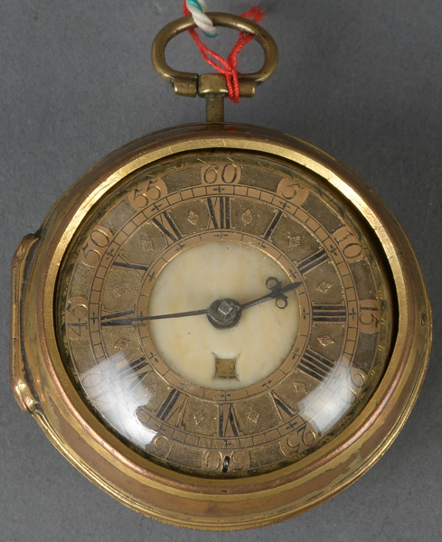 - Katalog-Nr: 175Taschenuhr. London, John May (aktiv 1692-1715). Vergoldet, mit Spindelwerk, verso sign. (D=4,7 cm). Dazu passendes Kupfer-Schutzgehäuse (D=5,4 cm) und Schlüssel. (Funktion ungeprüft)o.L.