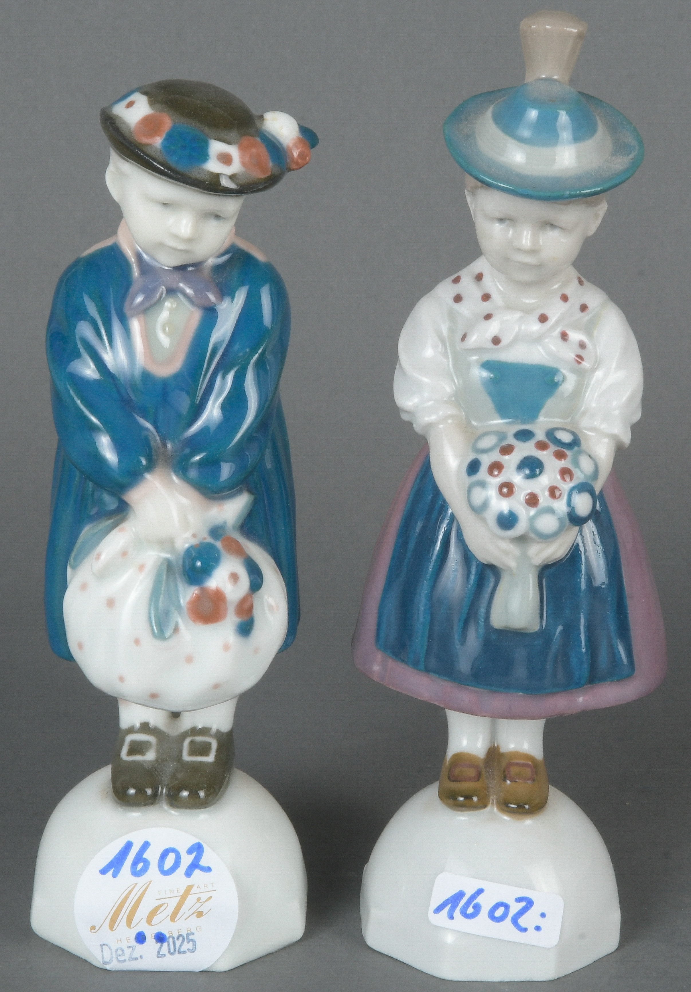 - Katalog-Nr: 1602Zwei Trachtenfiguren. Goebel 20. Jh. Porzellan, bunt bemalt; am Boden gemarkt, H=16,4 / 17,7 cm.o.L.