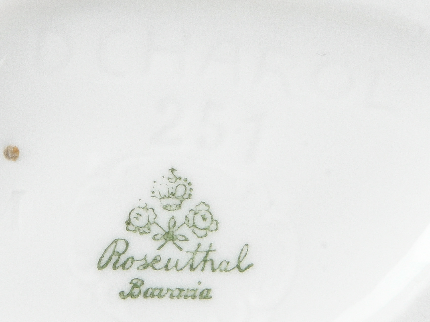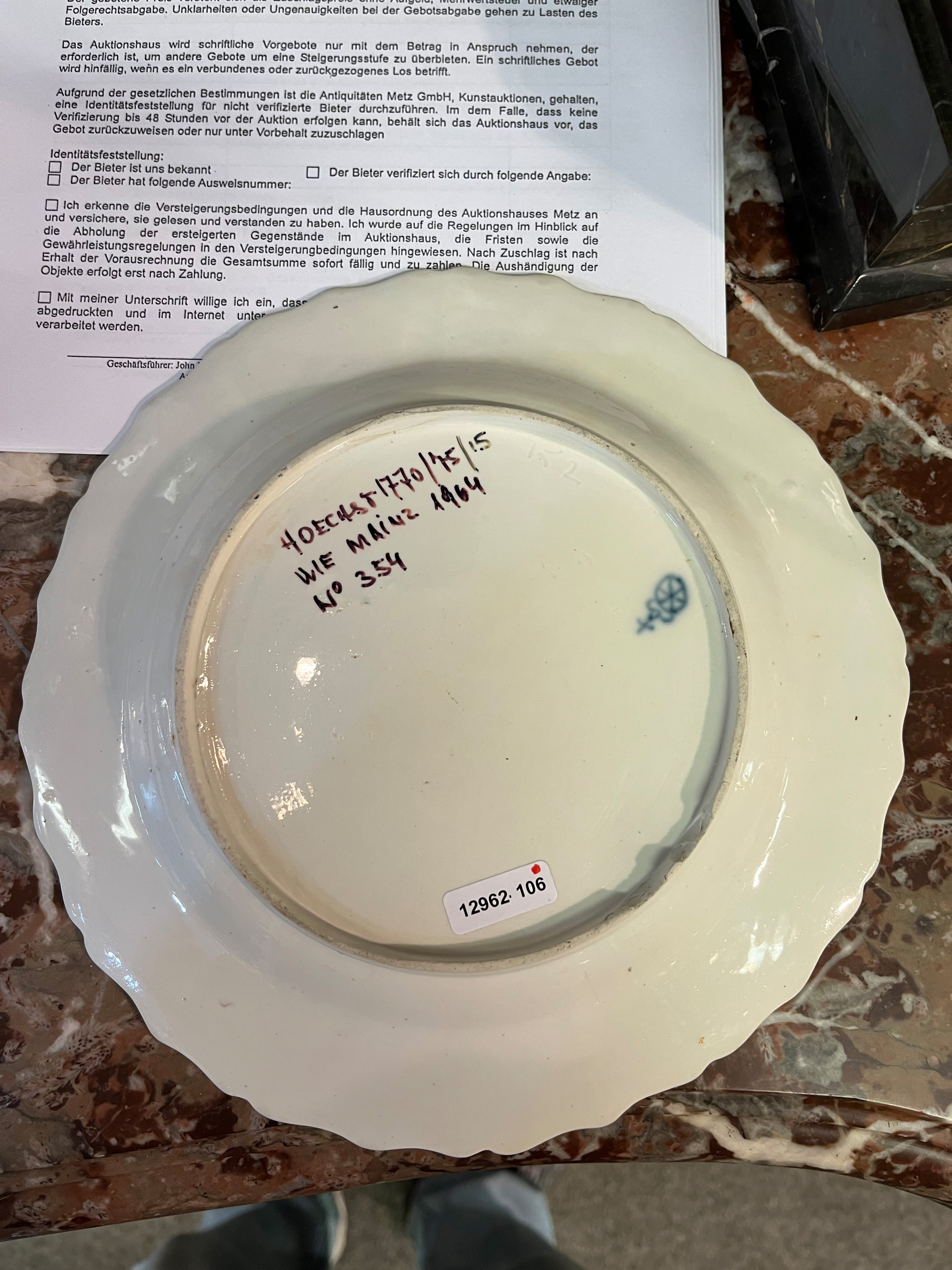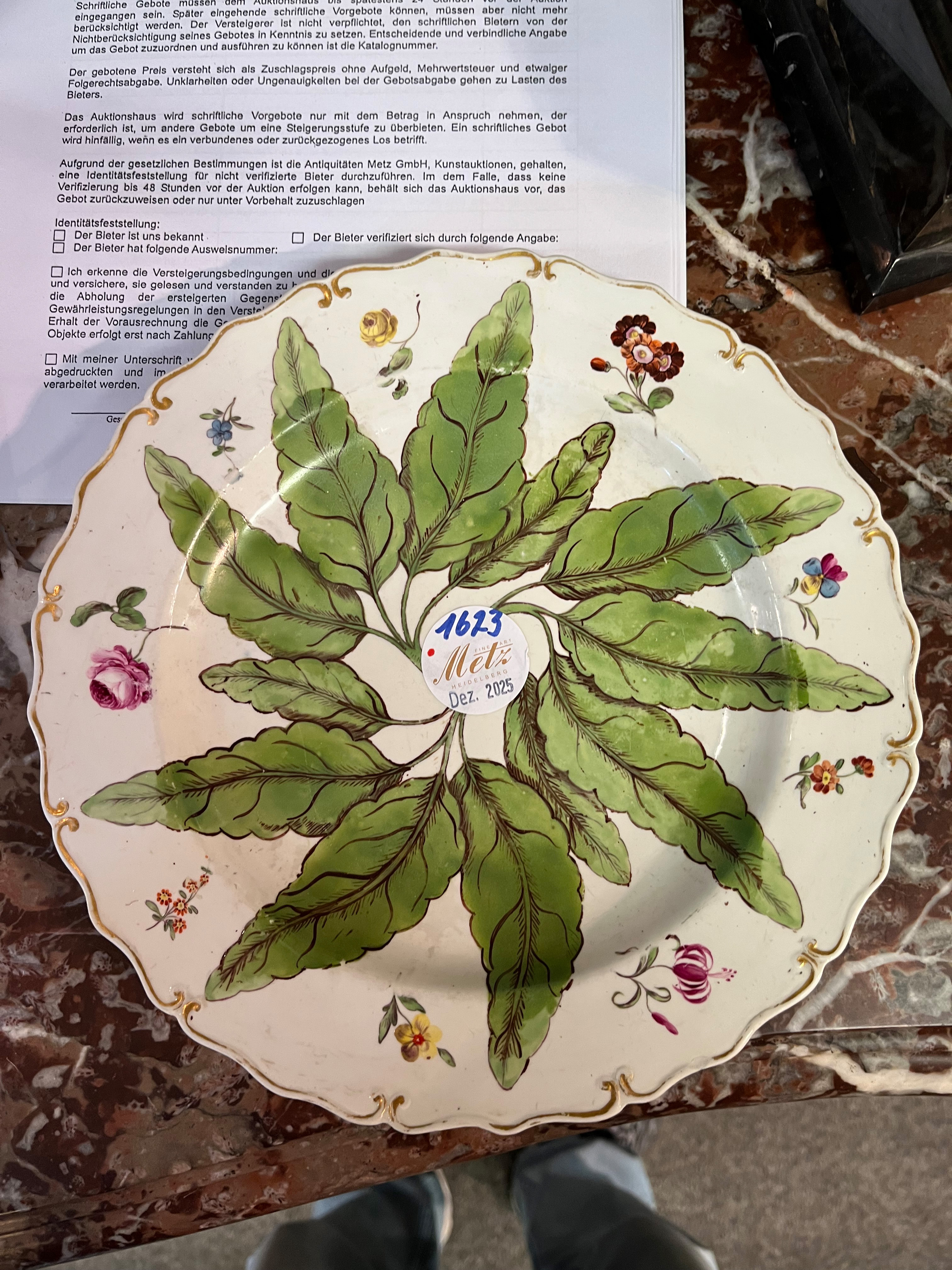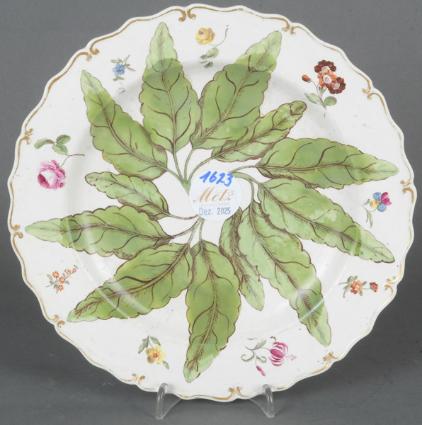 - Katalog-Nr: 1623Seltener Teller Höchst 1770. Porzellan, bunt bemalt mit Blattdekor und Streublumen; verso purpurne Radmarke, D=23 cm. Provenienz: Sammlung Bruno Sandner, Hofheim.o.L.