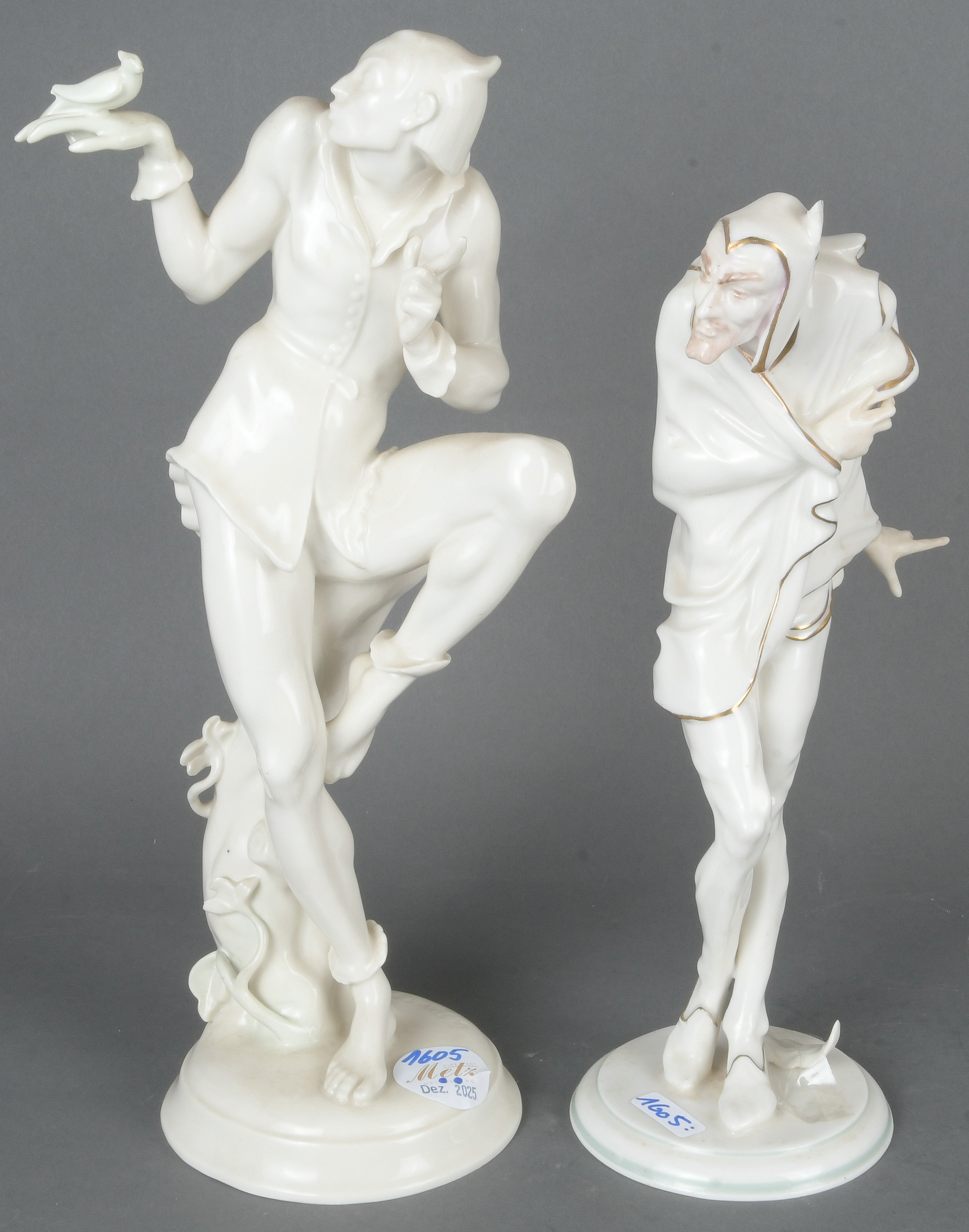 - Katalog-Nr: 1605Mephisto und Pierrot mit Vogel. Hutschenreuther / Schwarzburger Werkstätten 20. Jh. Porzellan, weiß glasiert, sparsam gold staffiert; am Boden gemarkt, Entwurf und sign. K.(arl) Tutter / G.(ustav) Oppel, H=28 /31,6 cm. (besch. / rest.)o.L.