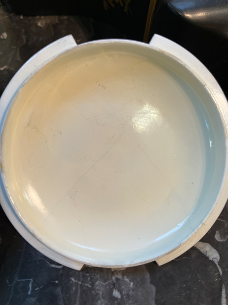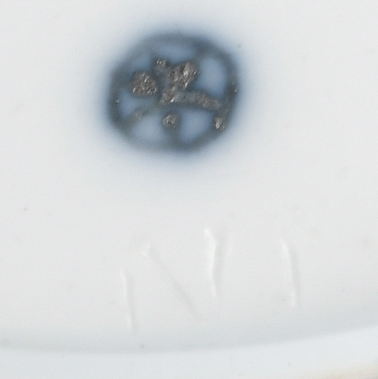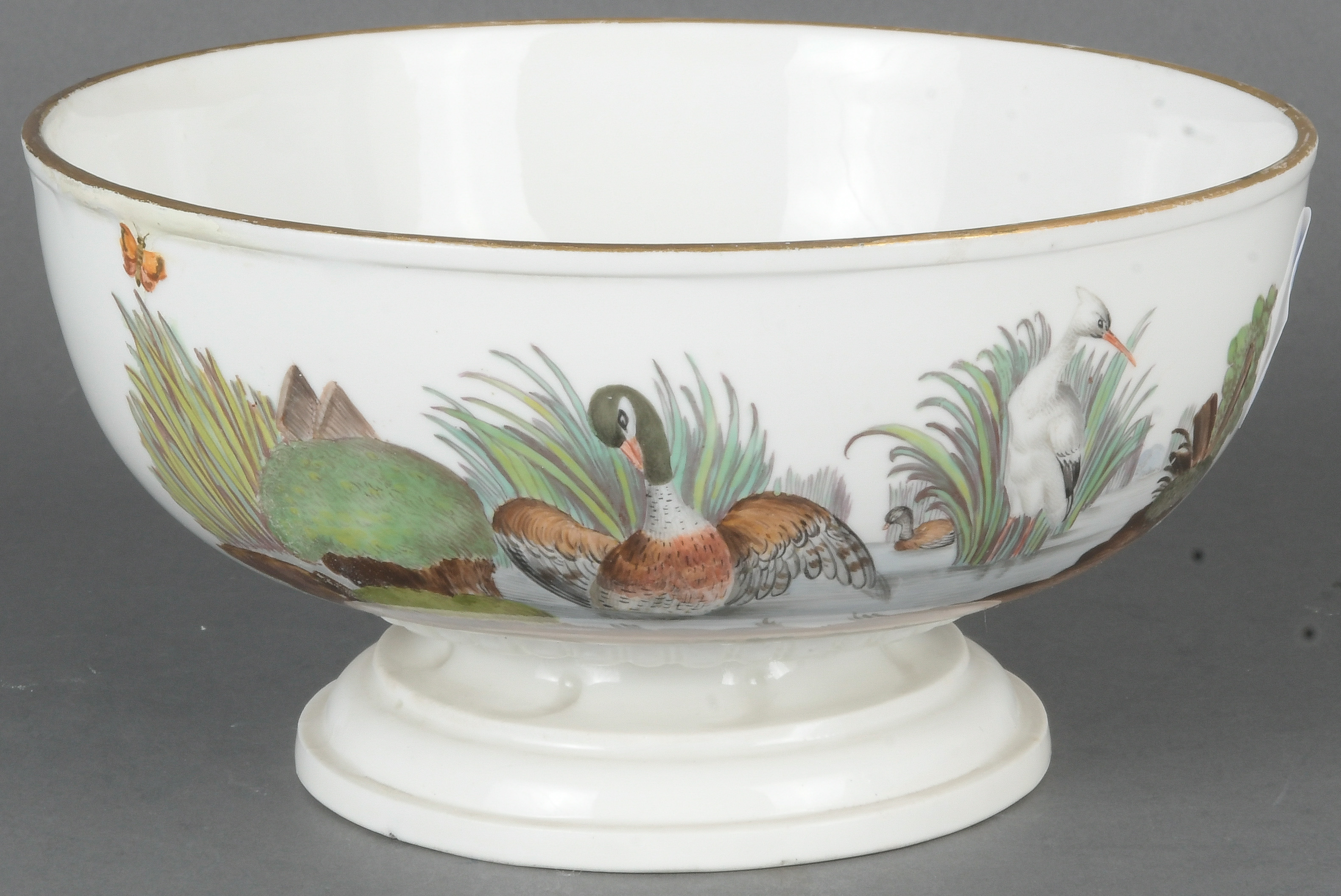 - Katalog-Nr: 1608Runde Kumme. Höchst 1775. Porzellan, bunt bemalt mit Wasservögeln; verso unterglasurblaue Radmarke, H=8,5 cm, D=16,8 cm. Provenienz: Sammlung Bruno Sandner, Hofheim. (Haarriss)o.L.
