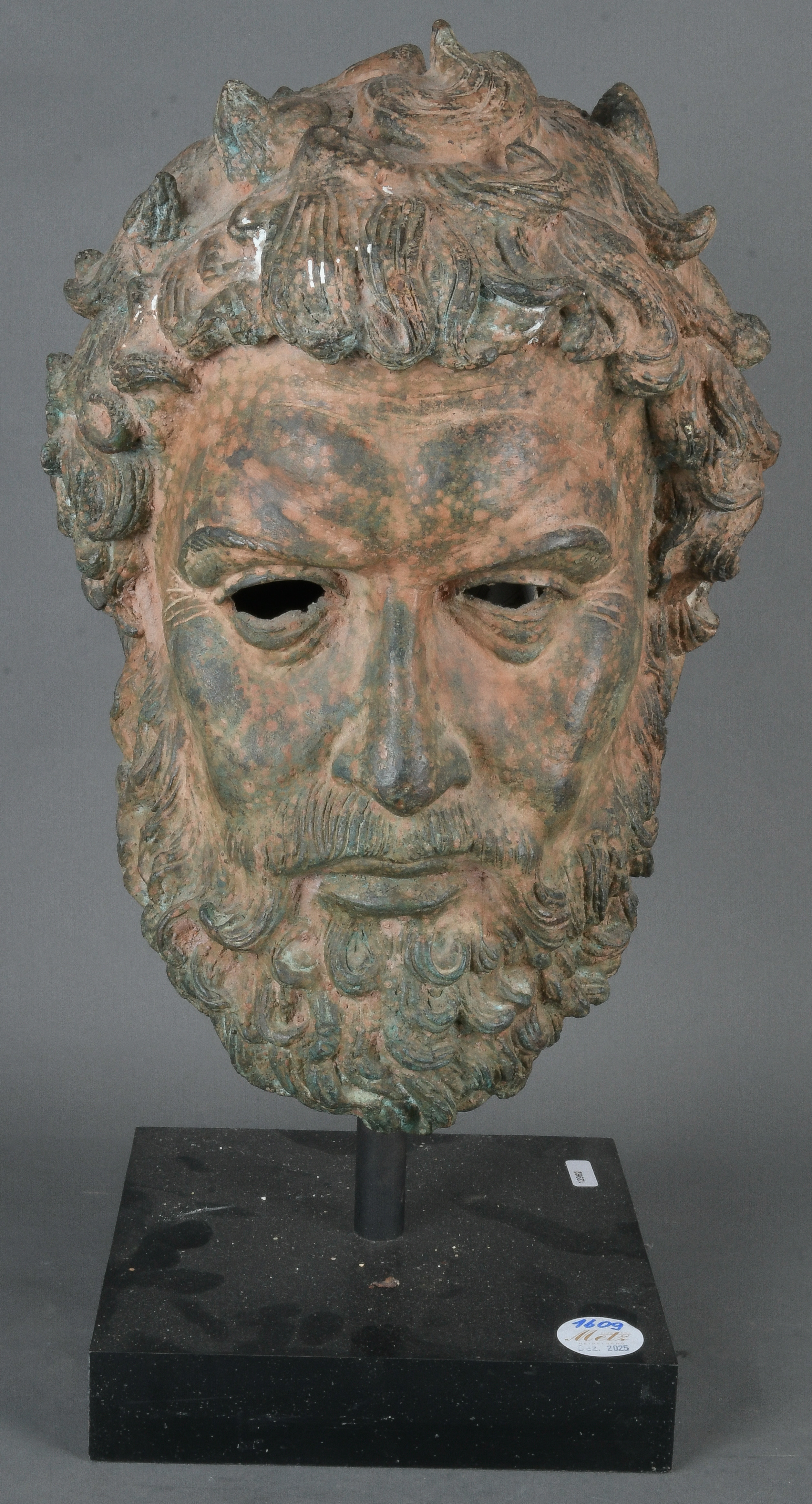 - Katalog-Nr: 1609Wohl italienischer Bildgießer des 20. Jhs. Kopf des Zeus vom Kap Artemision. Bronze, H=36 / 50 cm.o.L.