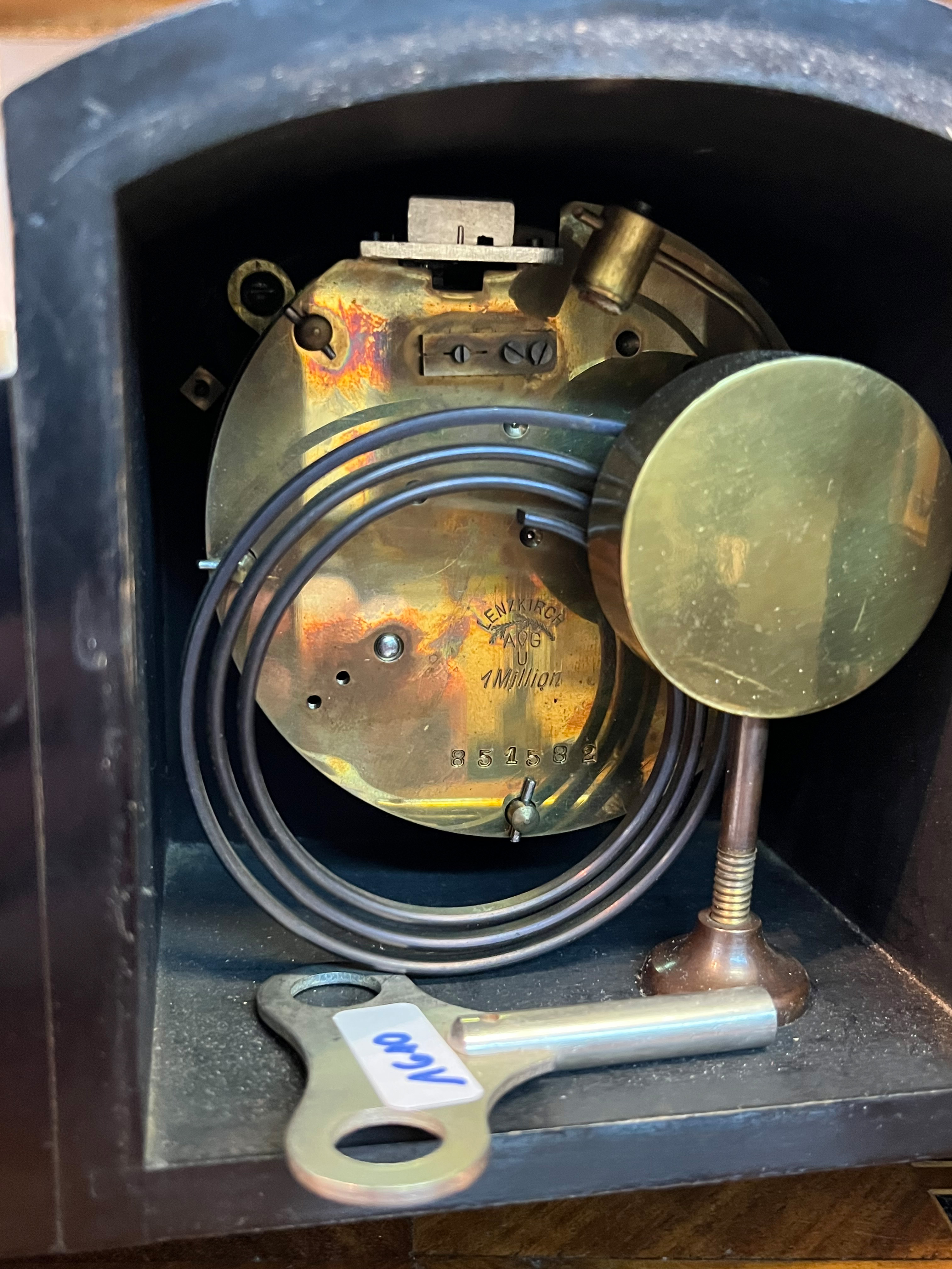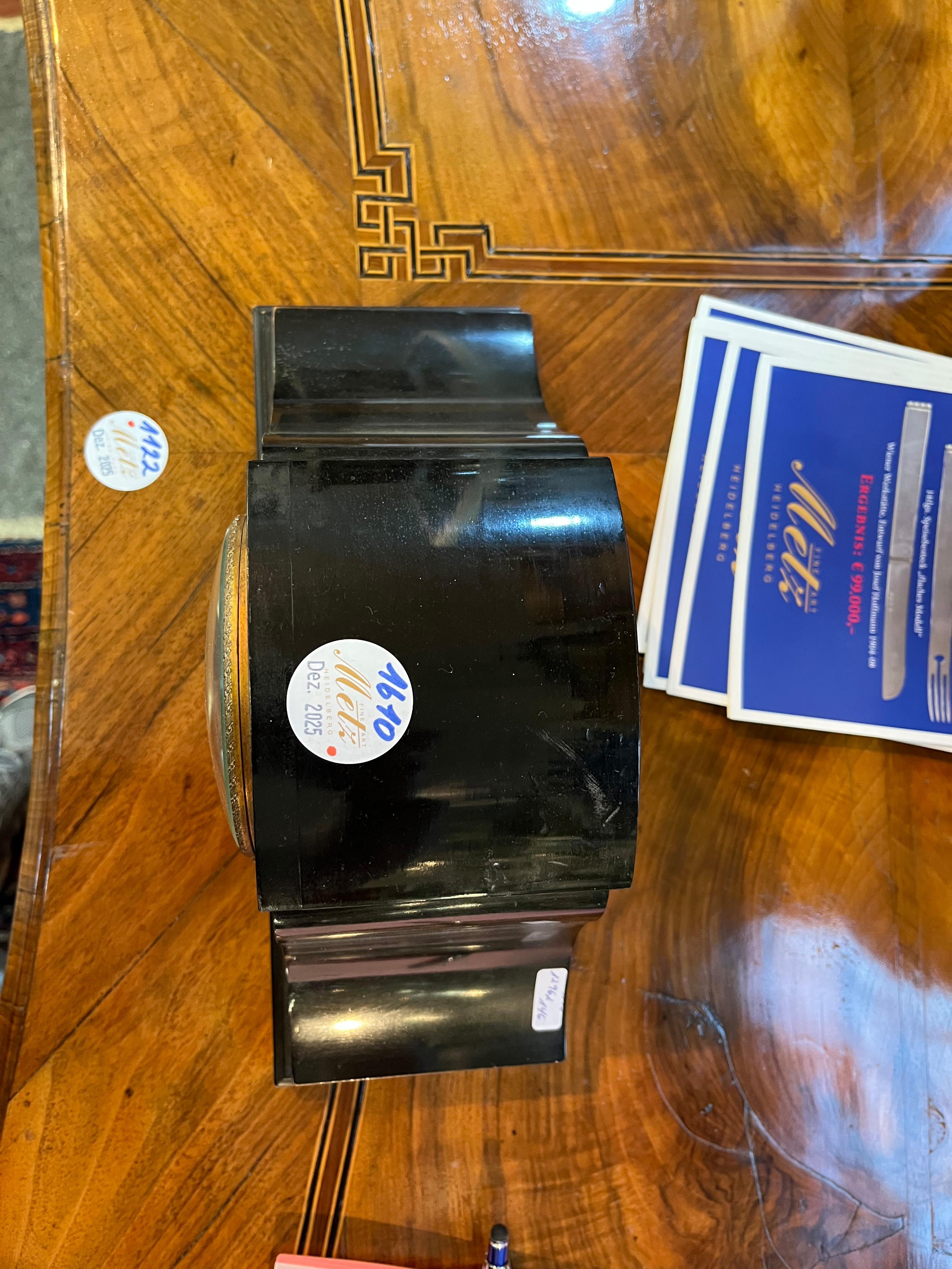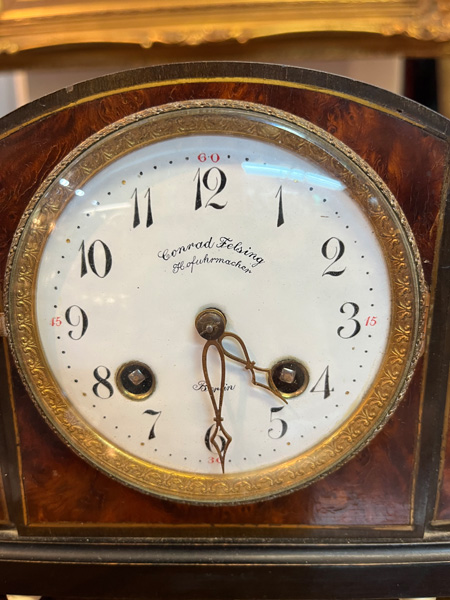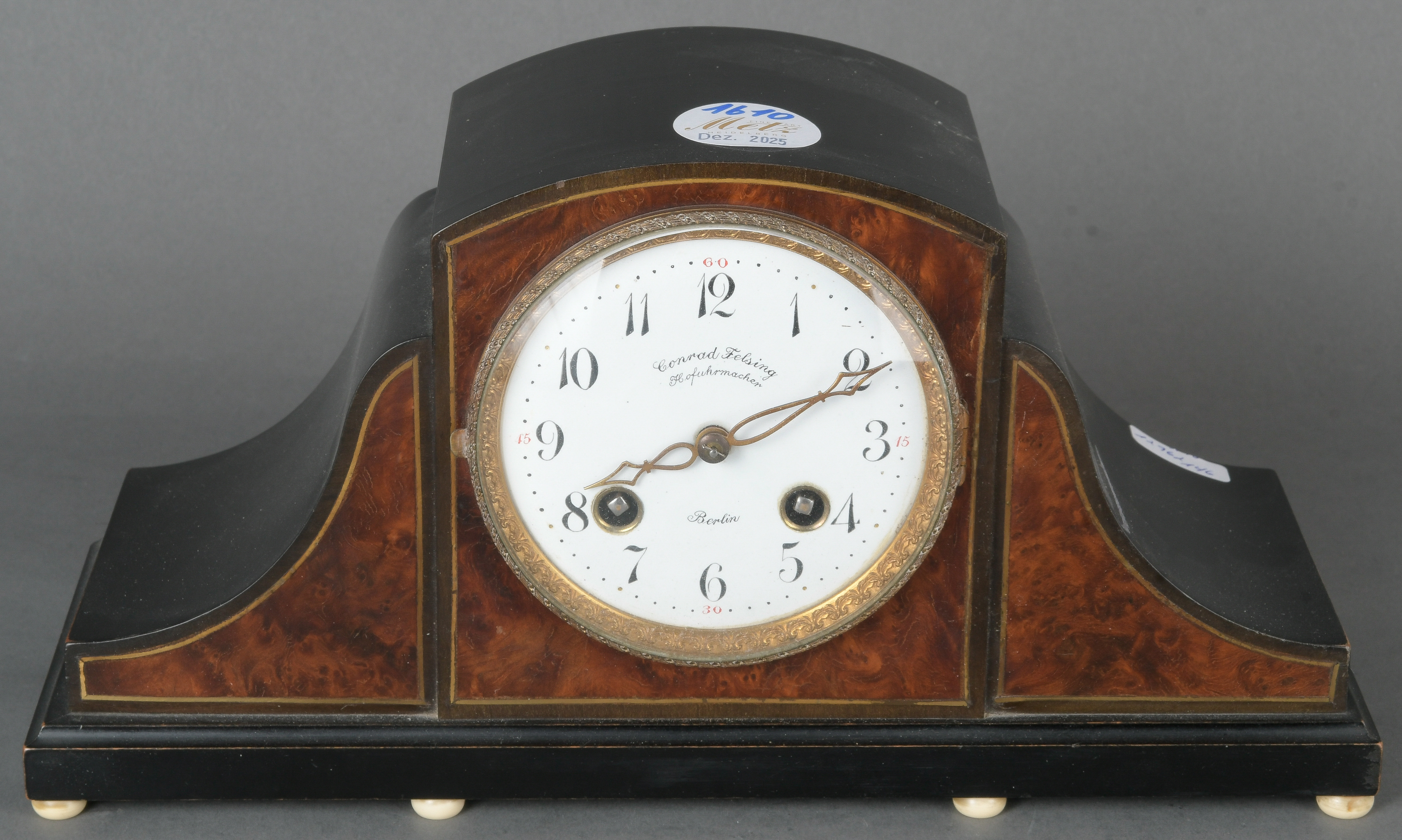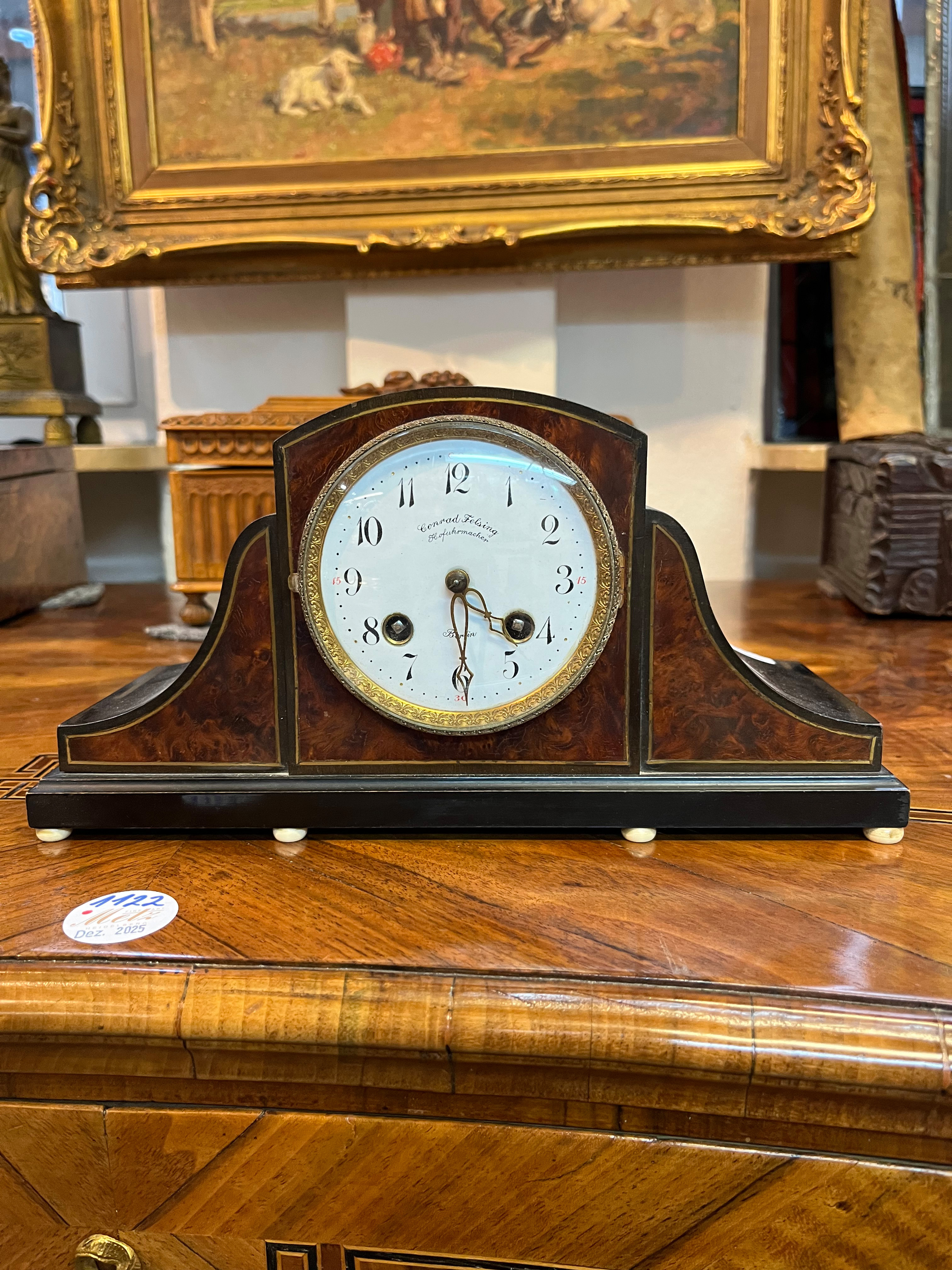 - Katalog-Nr: 1610Tischuhr. Berlin, Hofuhrmacher Conrad Felsing (1800-1870). Holzgehäuse, Emailzifferblatt mit doppeltem Schlüsselaufzug, Lenzkirch-Uhrwerk, H=15 cm. (Funktion ungeprüft)o.L.