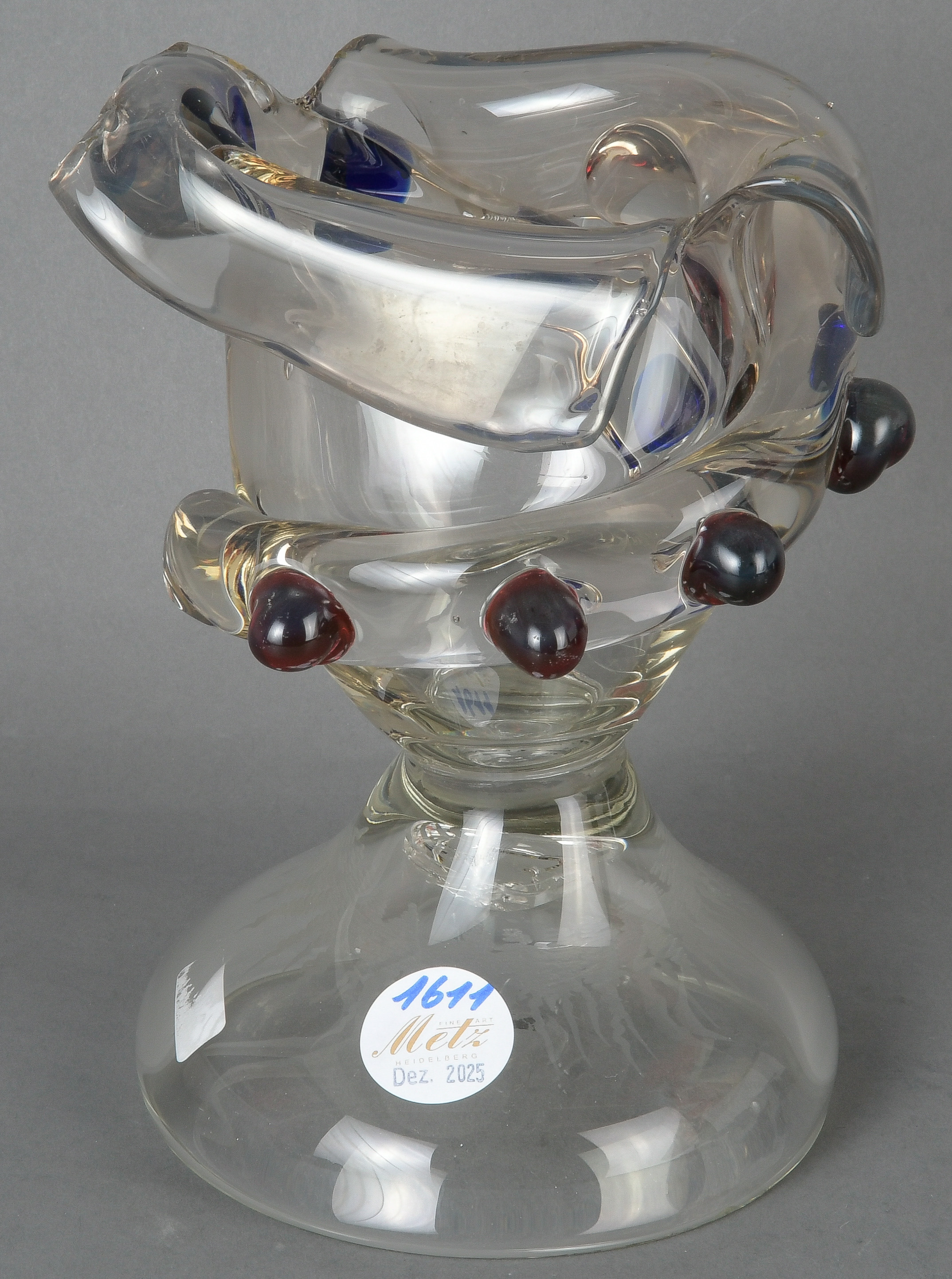- Katalog-Nr: 1611Vase. Wohl Murano 20. Jh. Farbloses Glas mit Aufschmelzungen, H=23 cm. (best.)o.L.
