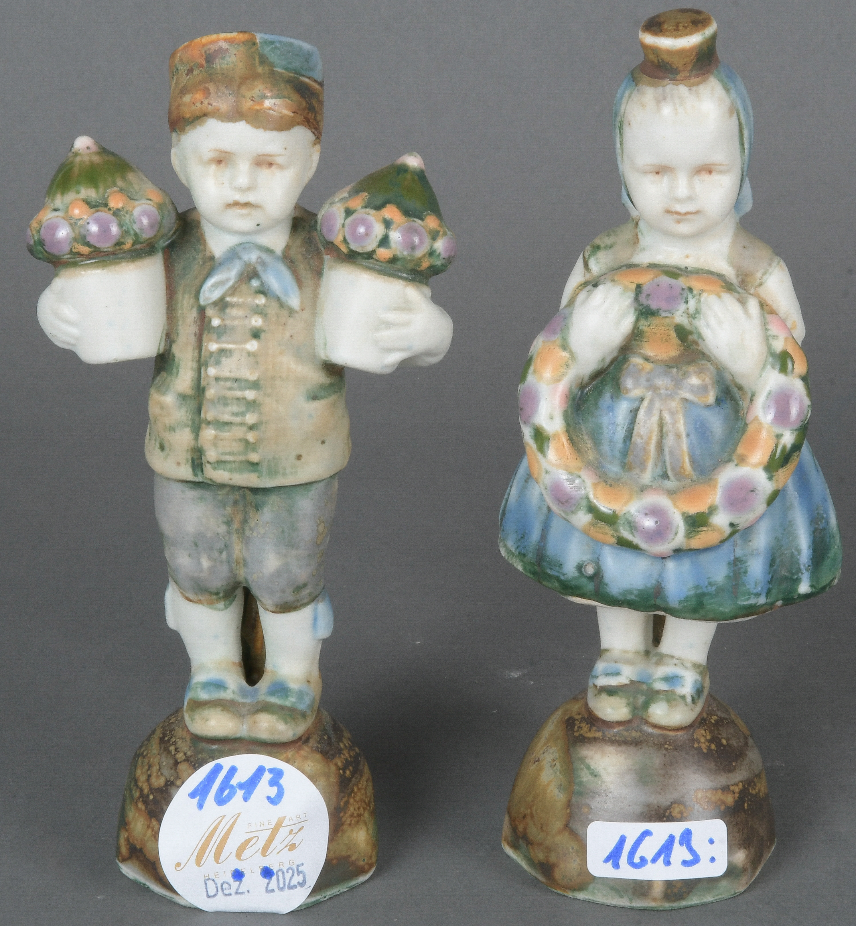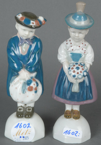 - Katalog-Nr: 1613Zwei Trachtenfiguren. Wohl Goebel 20. Jh. Porzellan, bunt bemalt; am Boden gemarkt, H=14,8 / 15,3 cm.o.L.