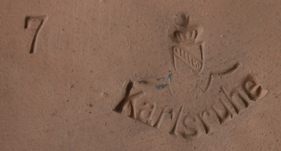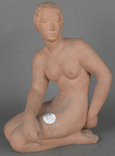 - Katalog-Nr: 1614Kniender Frauenakt. Karlsruher Majolika 20. Jh. Braunes Irdengut, am Boden gemarkt, Entwurf von Esther Eppens, H=35 cm.o.L.