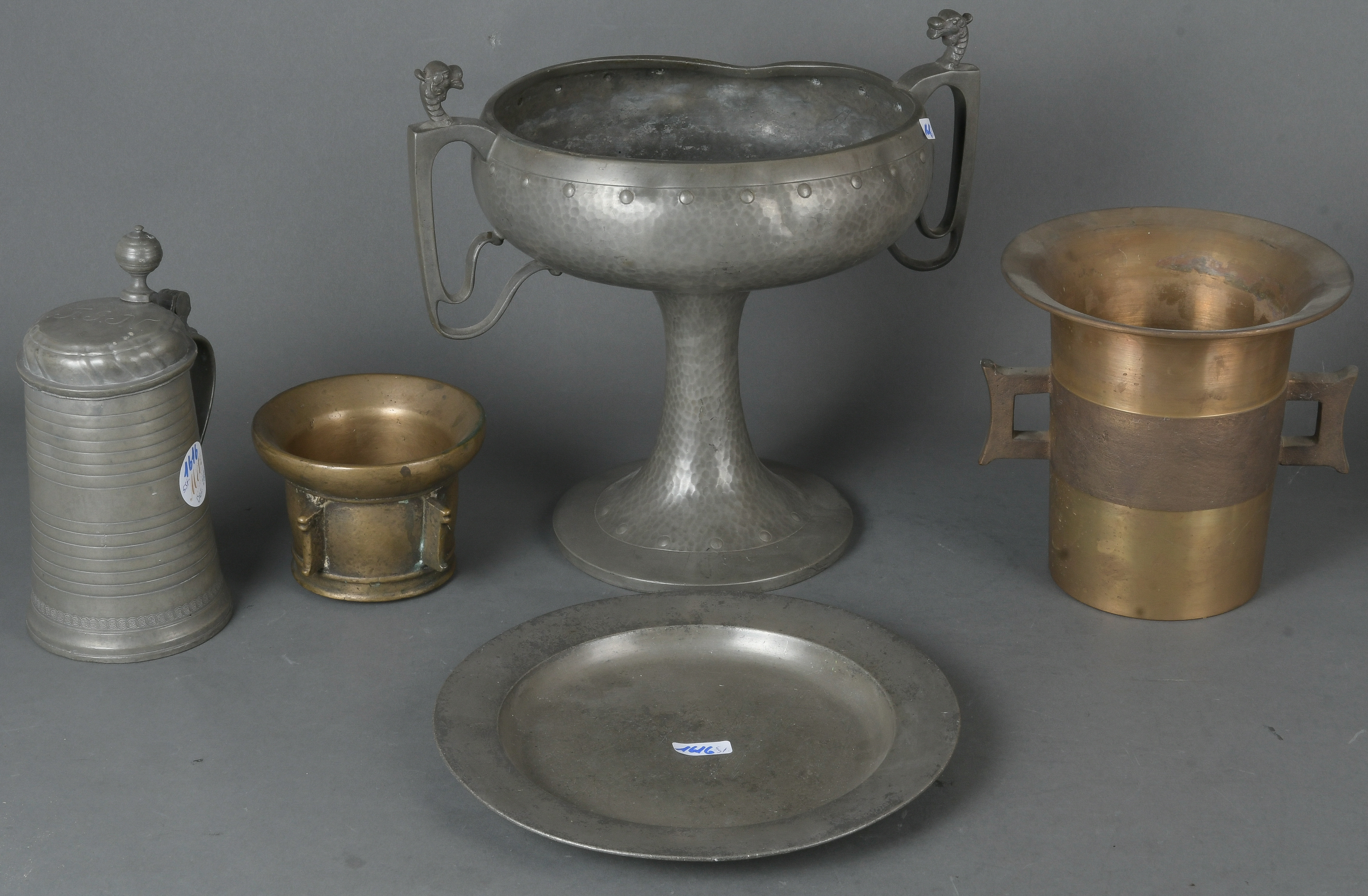 - Katalog-Nr: 1616Fünftlgs. Konvolut Bronze / Zinn. Deutschland / Italien 17. bis 20. Jh. Bestehend aus: Zwei Mörser (H=8,5 / 16 cm), ein Tafelaufsatz (H=25 cm), ein Teller (D=23 cm) und ein Krug (H=18,5 cm).o.L.