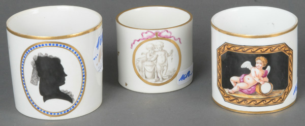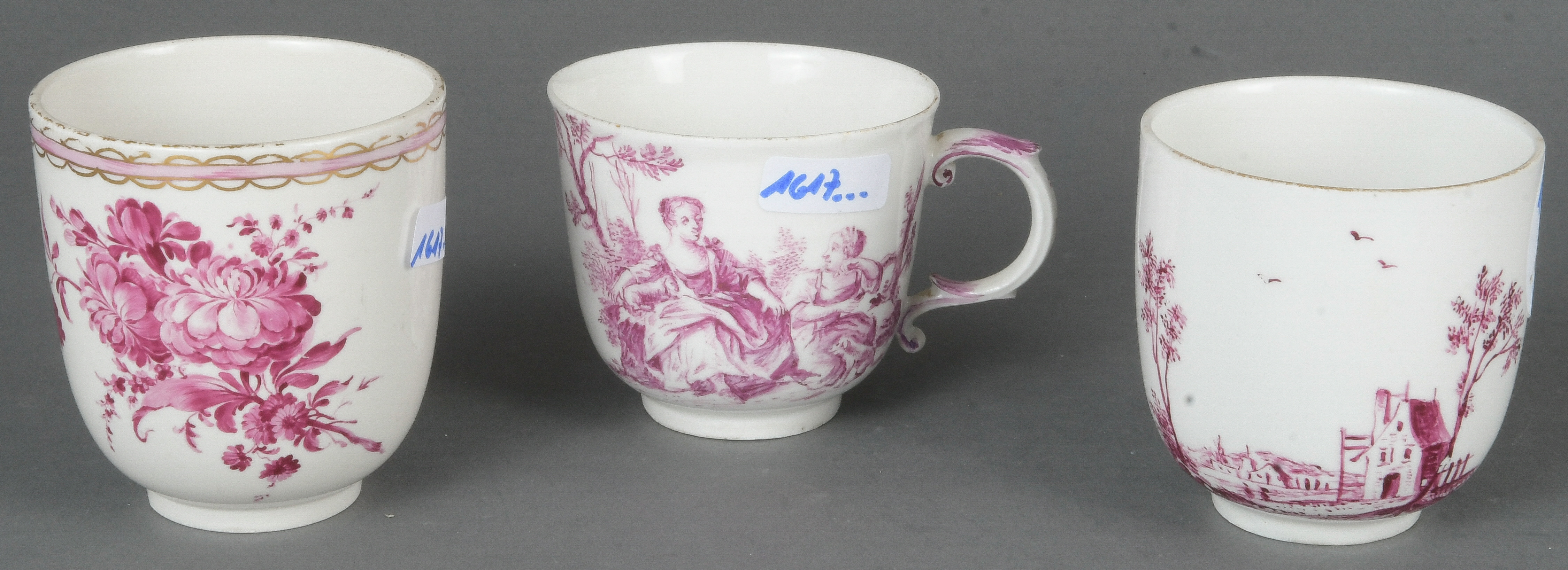 - Katalog-Nr: 1617Drei Bechertassen. Höchst 1760-65. Porzellan, purpurn bemalt mit Blumenbouquet, Personenstaffage und Landschaften. Provenienz: Sammlung Bruno Sandner, Hofheim.o.L.