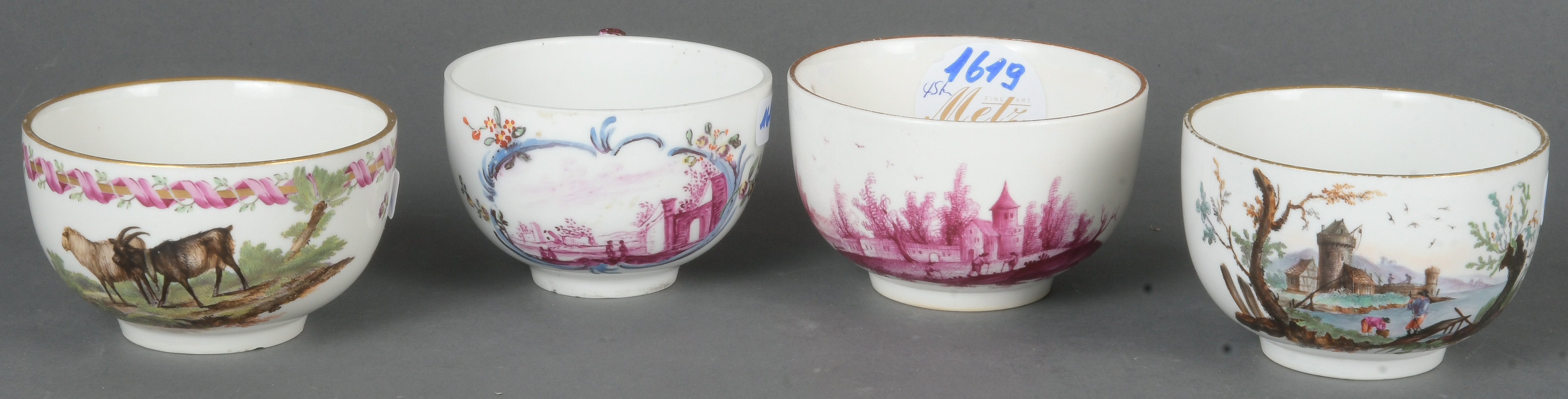- Katalog-Nr: 1619Vier Tassen. Höchst 1765-70. Porzellan, bunt und purpurn bemalt mit Schaf und Ziege in Landschaften; am Boden unterglasurblaue Radmarke. Provenienz: Sammlung Bruno Sandner, Hofheim.o.L.