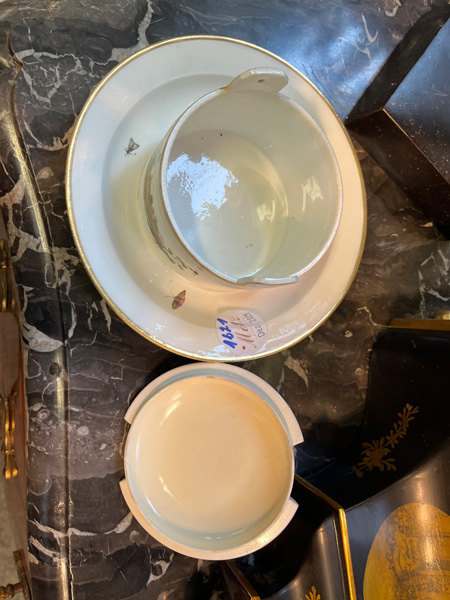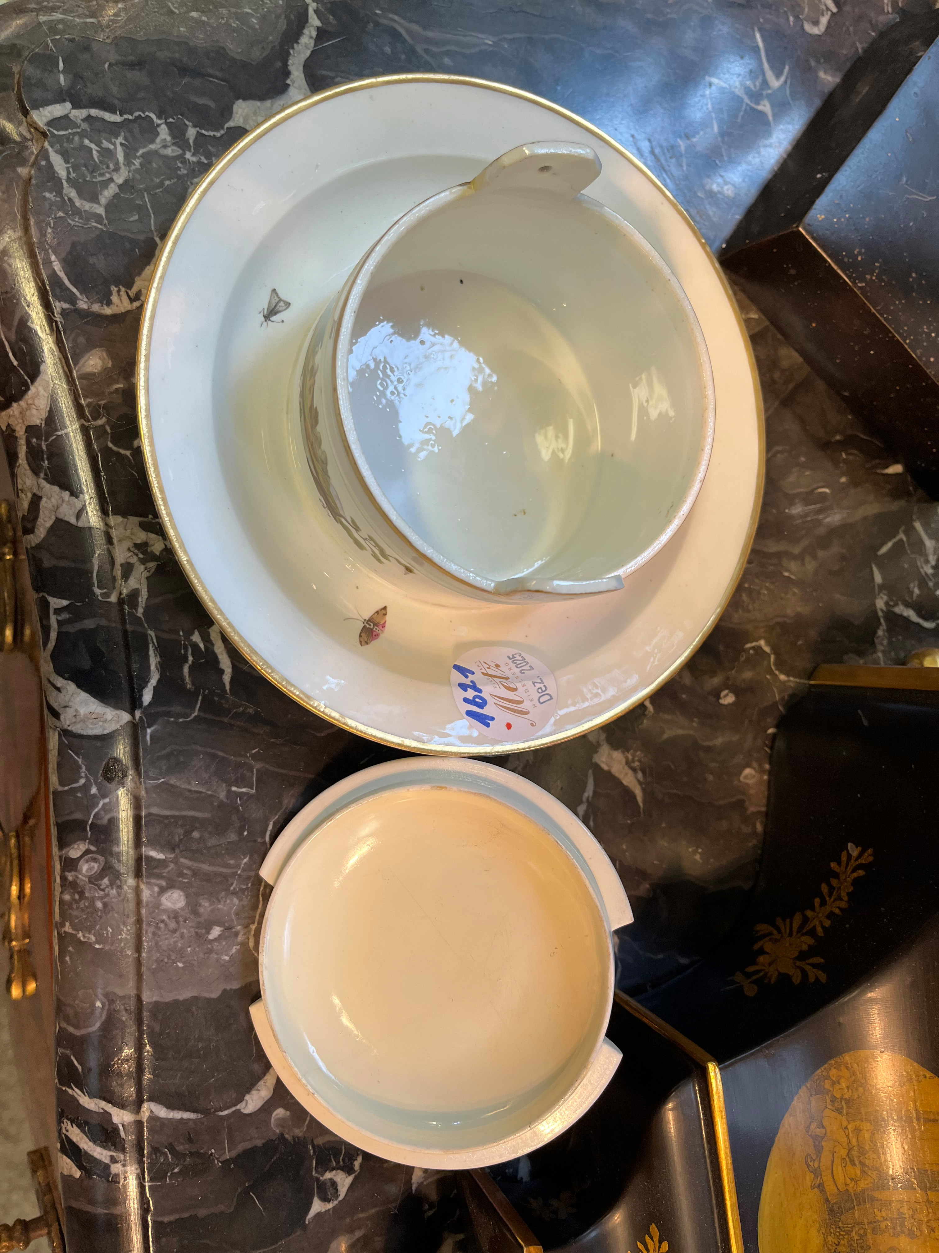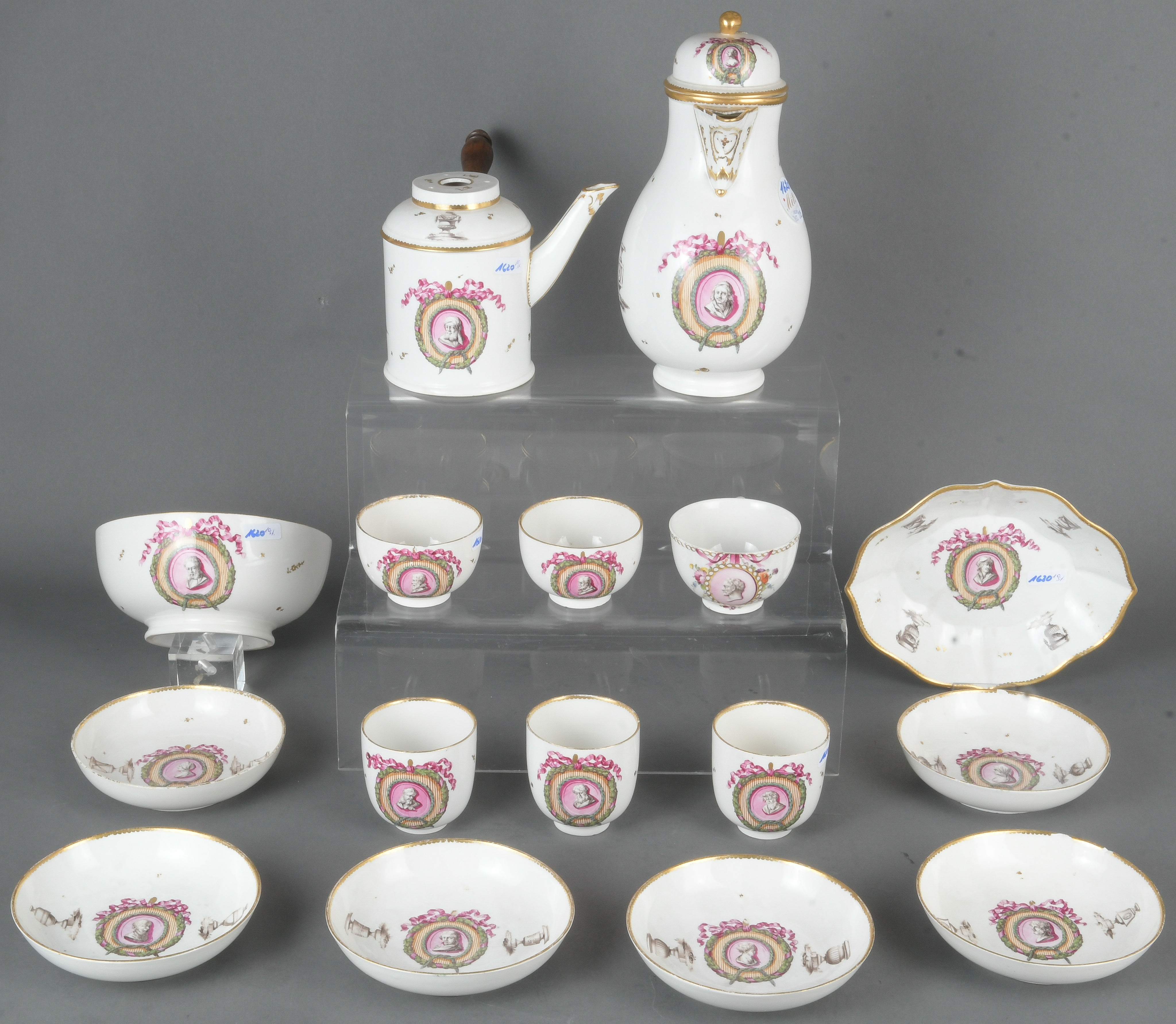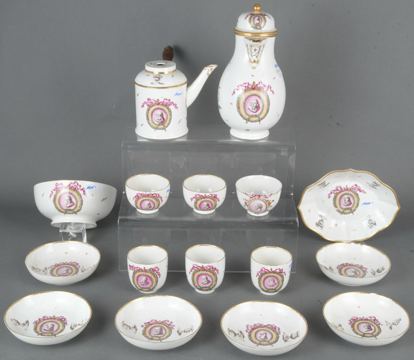 - Katalog-Nr: 162013-tlgs. Service. Höchst 1775. Porzellan, graucamaieu bemalt mit antikisierenden Köpfen in Eichenlaubkranz; am Boden unterglasurblaue Radmarke. Bestehend aus: Eine Kanne (H=24 cm), eine Chocolatière (H=13,5 cm), eine Kumme (H=7 cm, D=15 cm), eine ovale Löffelschale (H=3,5 cm, B=18,5 cm, T=15,5 cm), drei Teetassen und drei Bechertassen mit sechs Unterschalen. Provenienz: Sammlung Bruno Sandner, Hofheim. (best. / besch. / rest.)o.L.