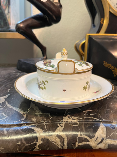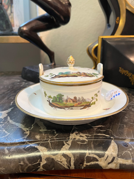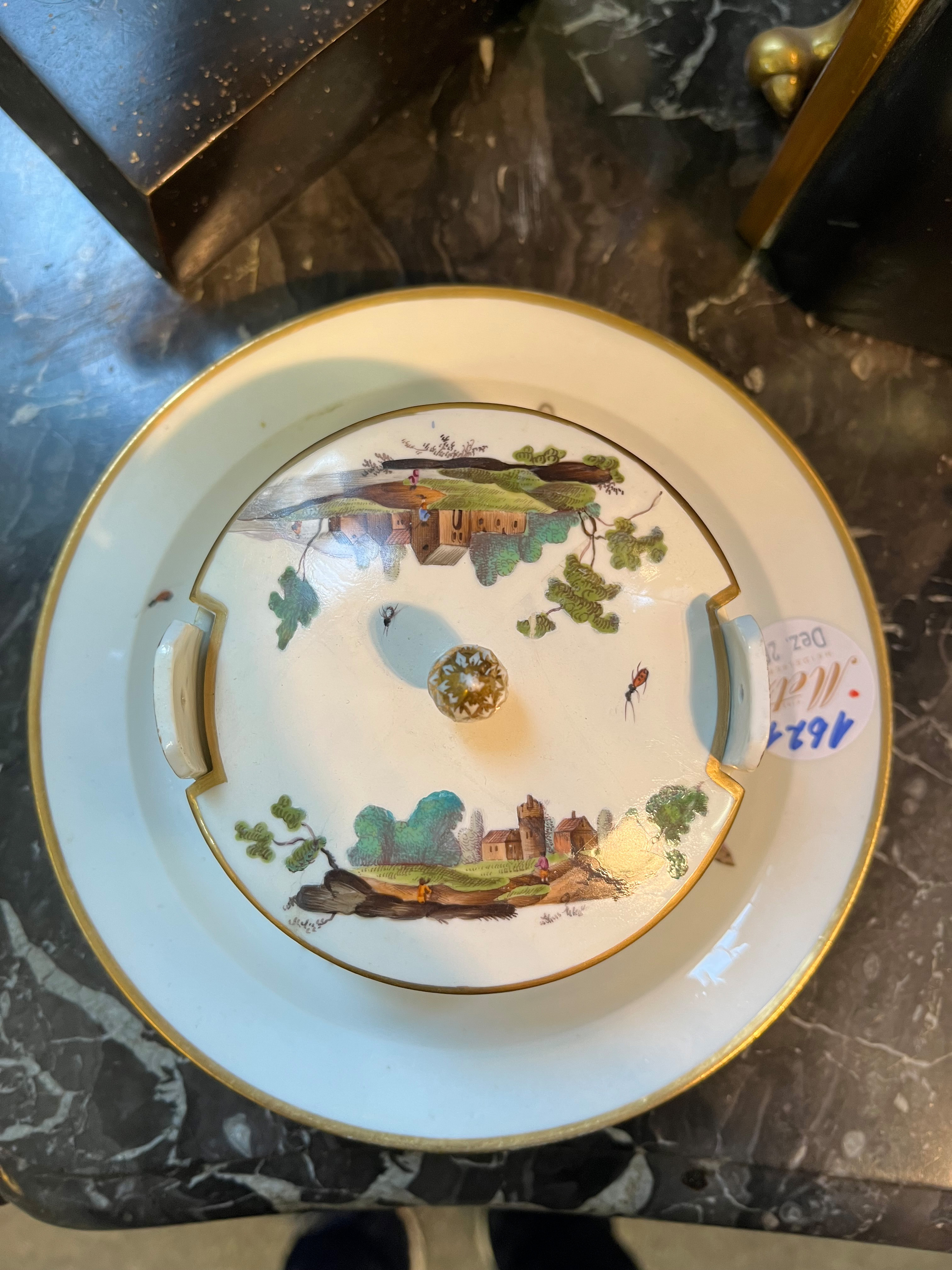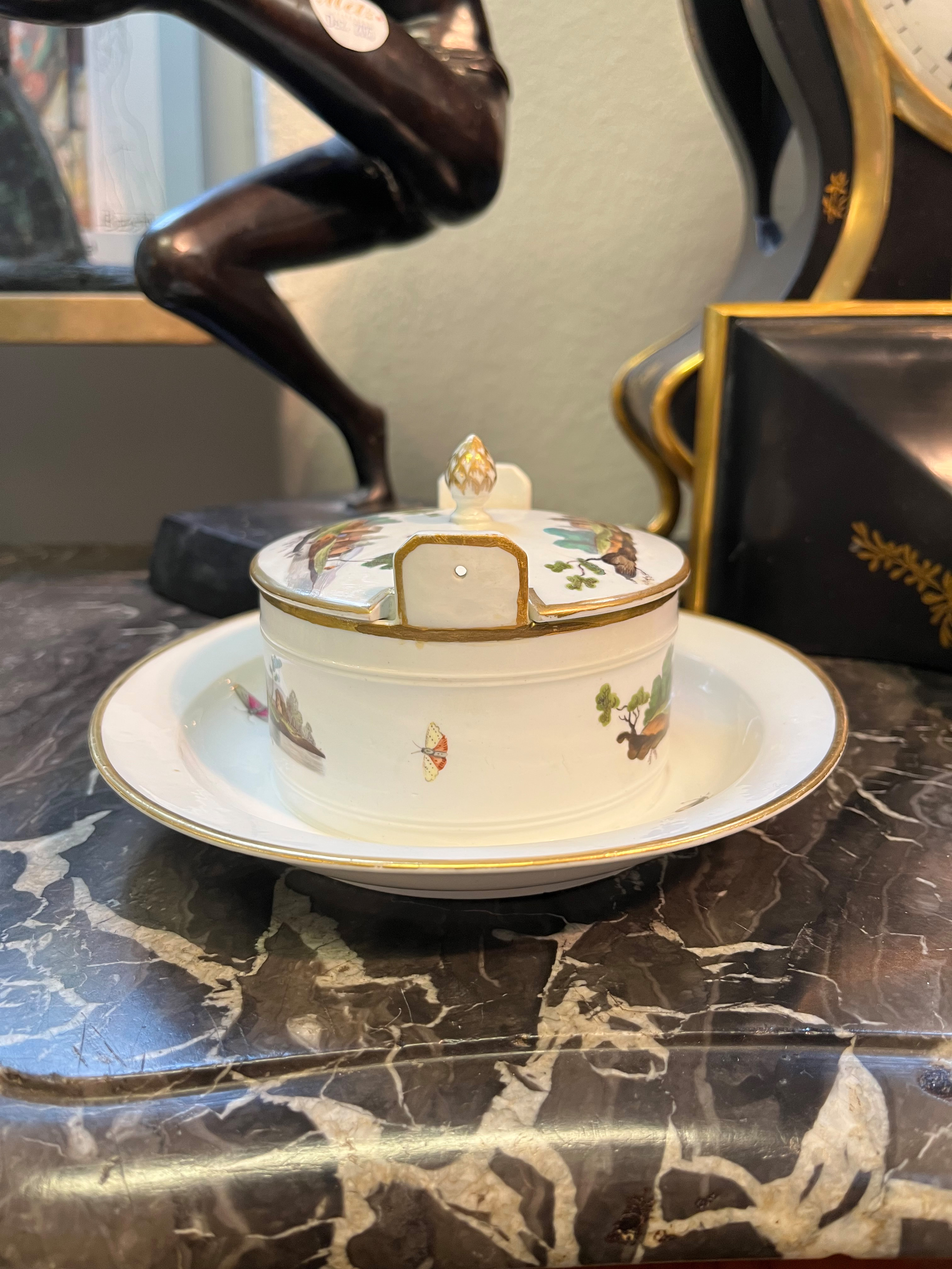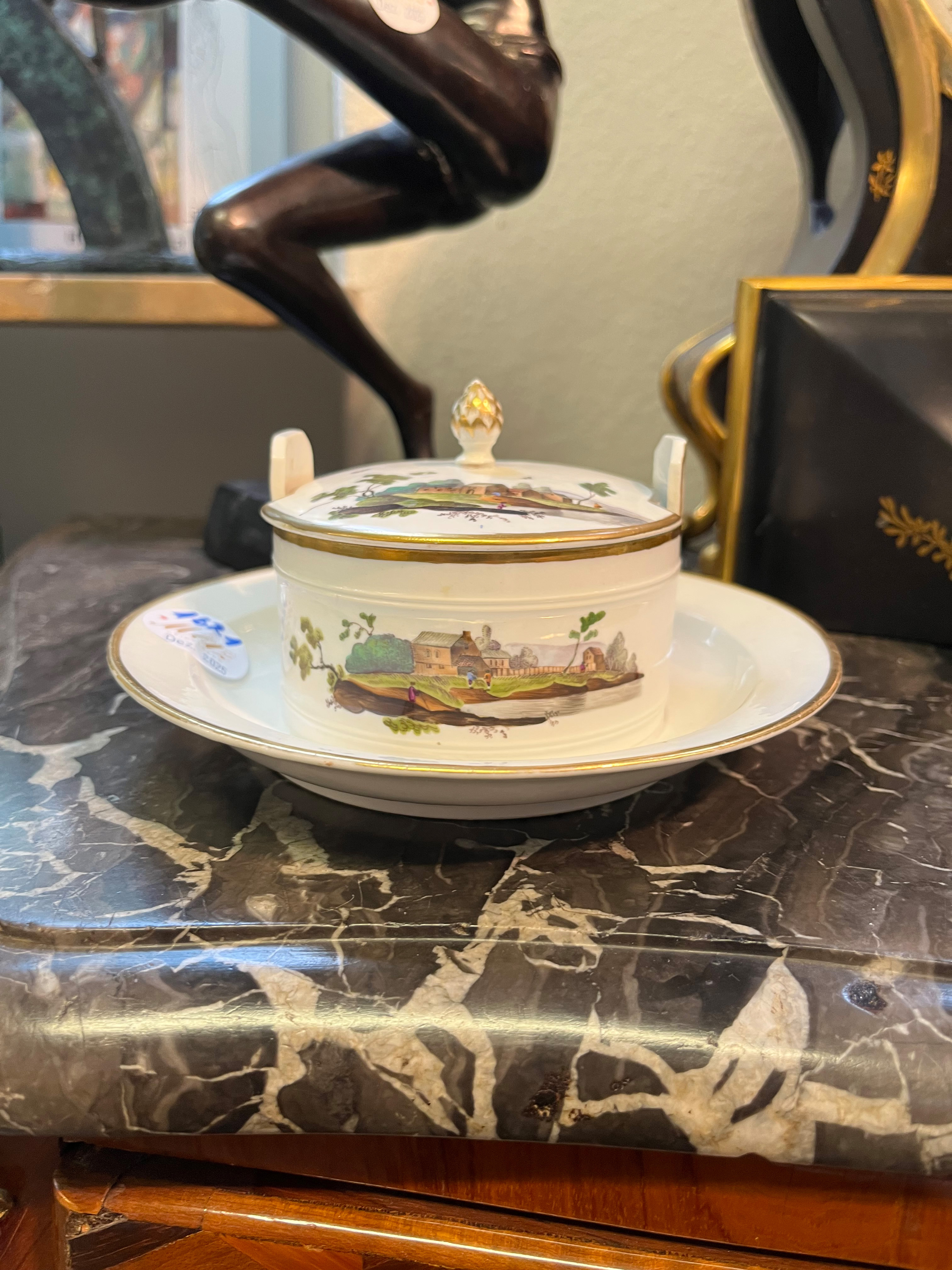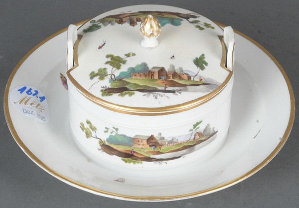 - Katalog-Nr: 1621Butterdose. Höchst 1770. Porzellan, bunt bemalt mit Architekturlandschaften und Personenstaffage; verso unterglasurblaue Radmarke, H=7,3 cm, D=18 cm. Provenienz: Sammlung Bruno Sandner, Hofheim. (Deckel rest.)o.L.