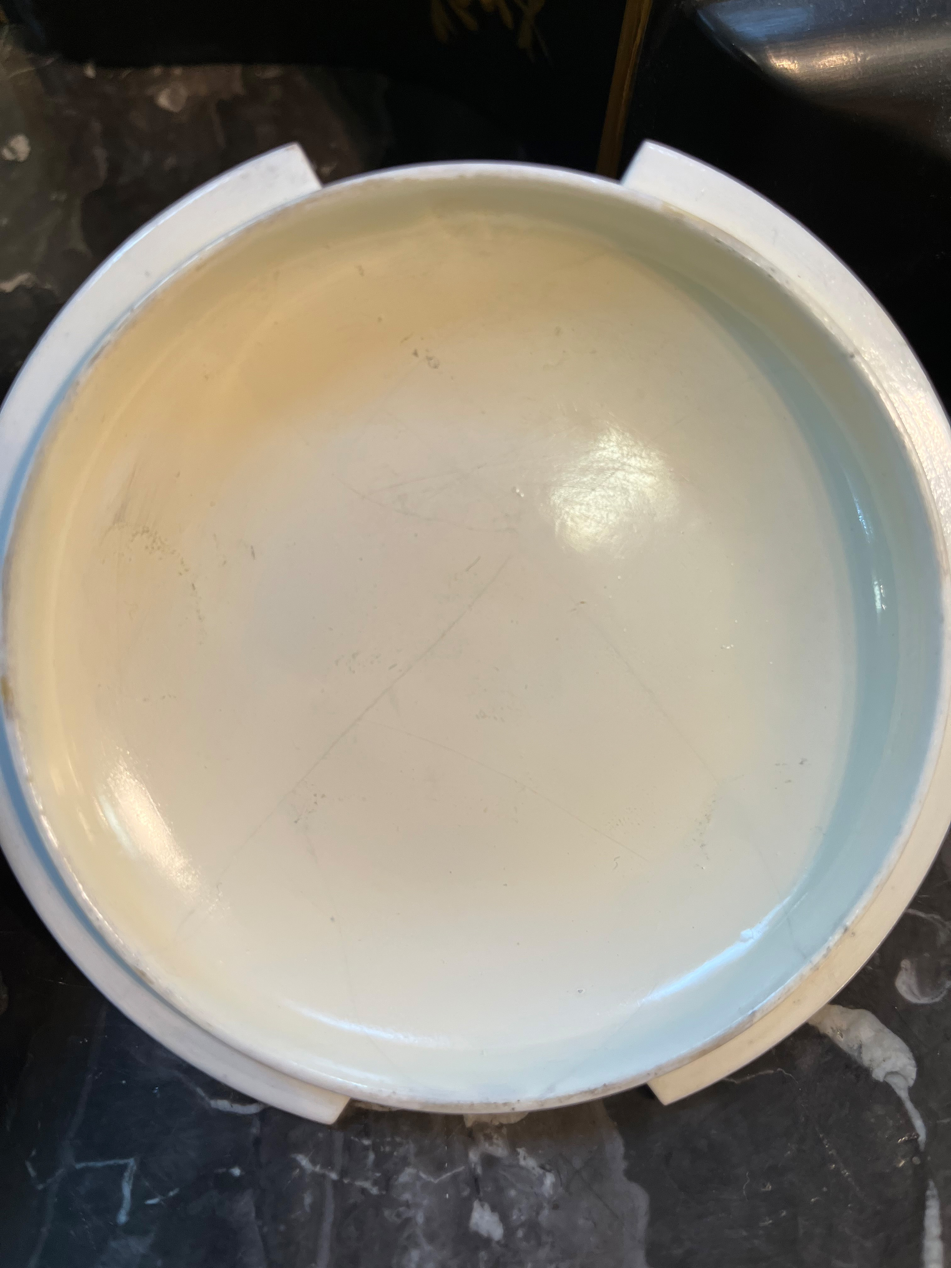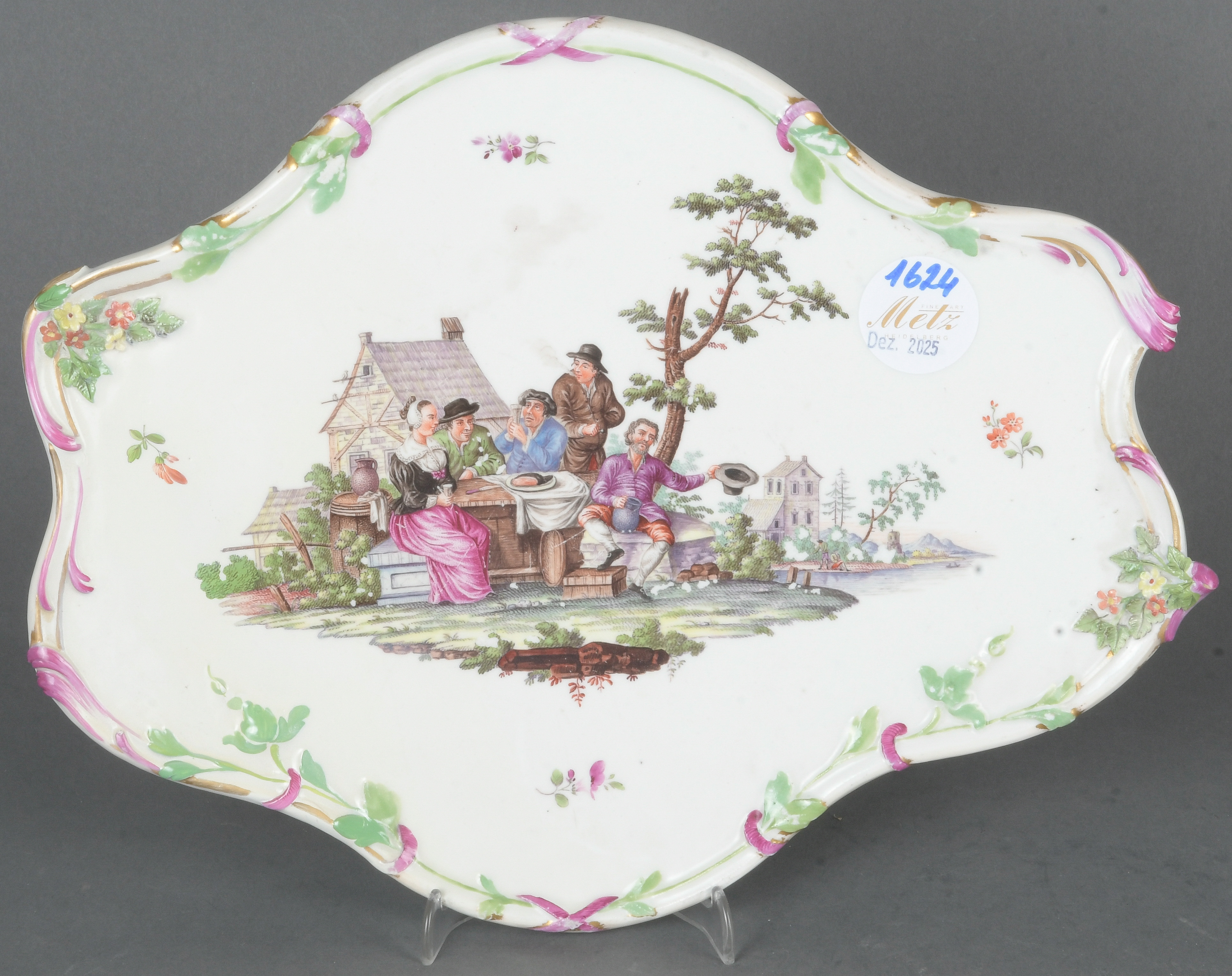 - Katalog-Nr: 1624Ovales Tablett. Wien 1775. Porzellan, bunt bemalt ländlichen Szenen; verso unterglasurblaue Schildmarke, H=2,4 cm, B=29 cm, T=24 cm. (rest.)o.L.