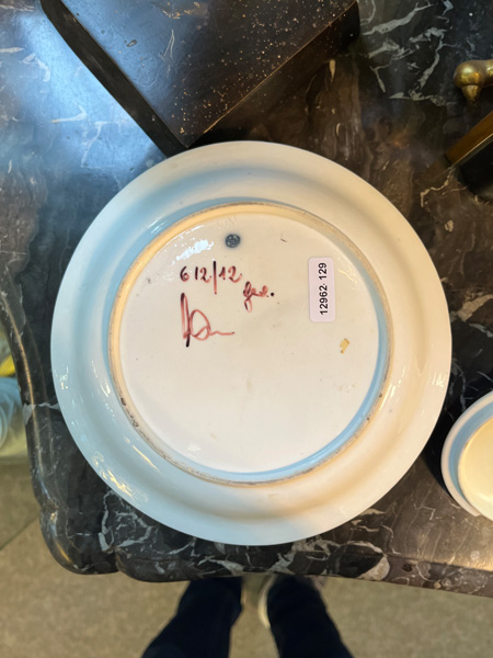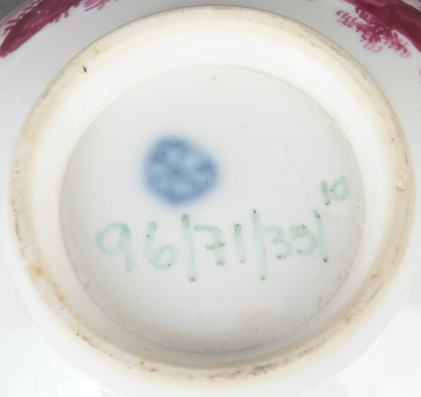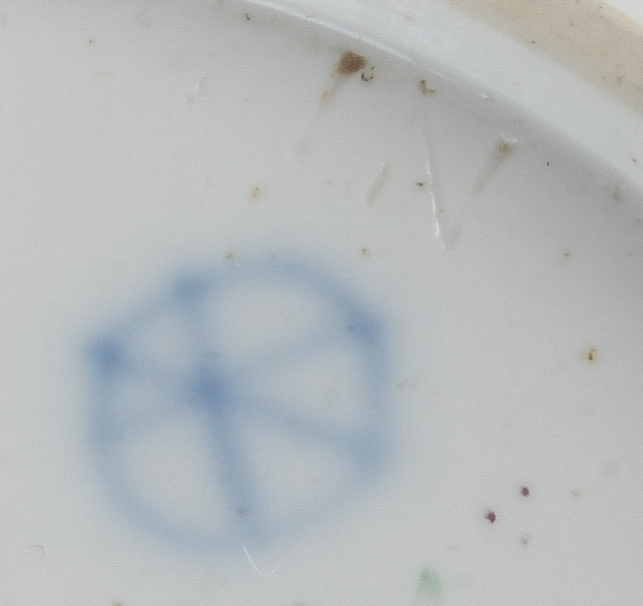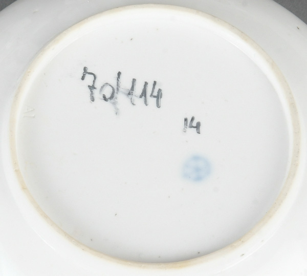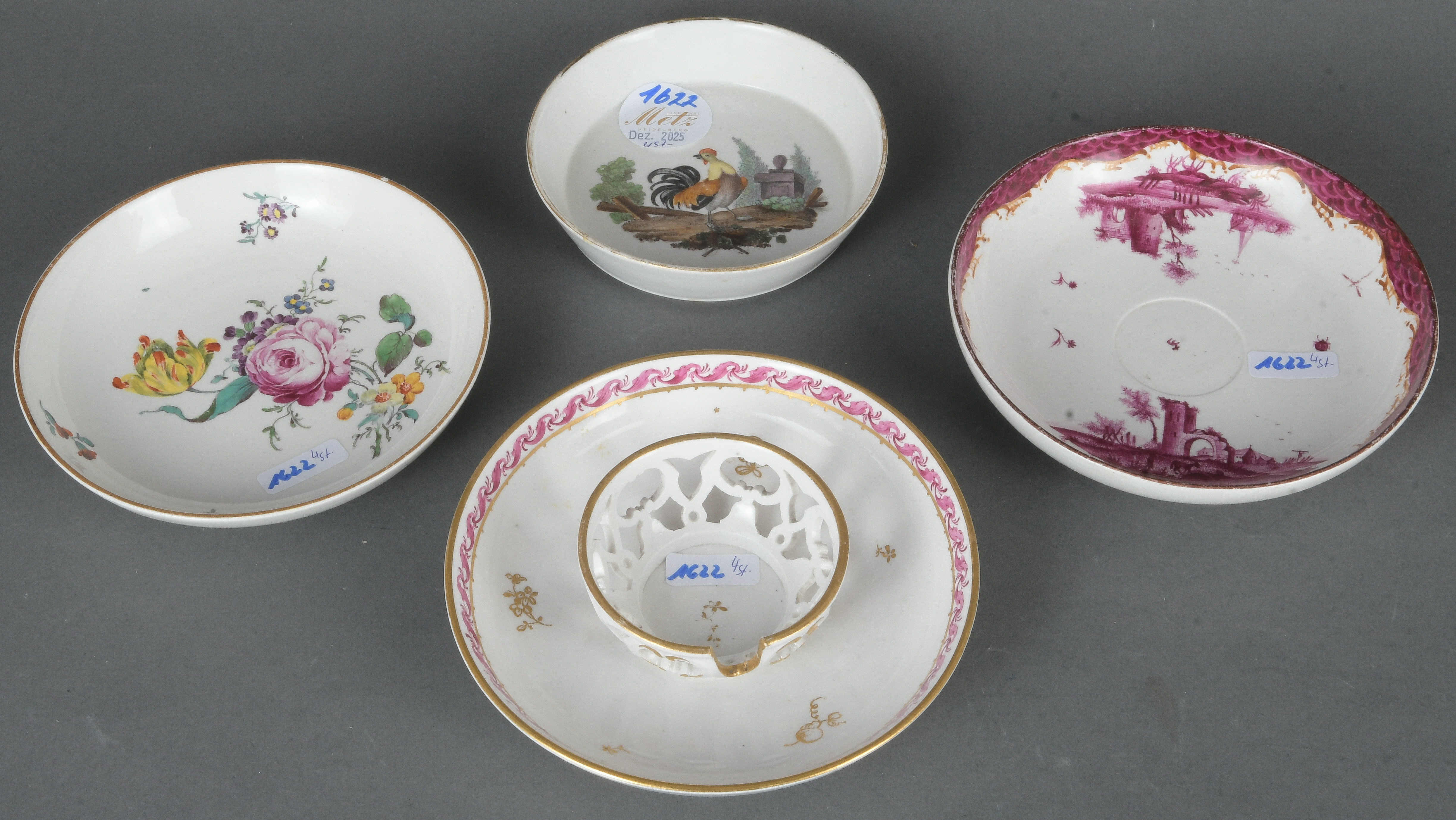 - Katalog-Nr: 1622Vier Unterschalen. Höchst 1770. Porzellan, bunt bzw. purpurn bemalt mit Floraldekor, Federvieh und Architekturen; am Boden unterglasurblaue Radmarke, D=11 bis 13,5 cm. Provenienz: Sammlung Bruno Sandner, Hofheim.o.L.