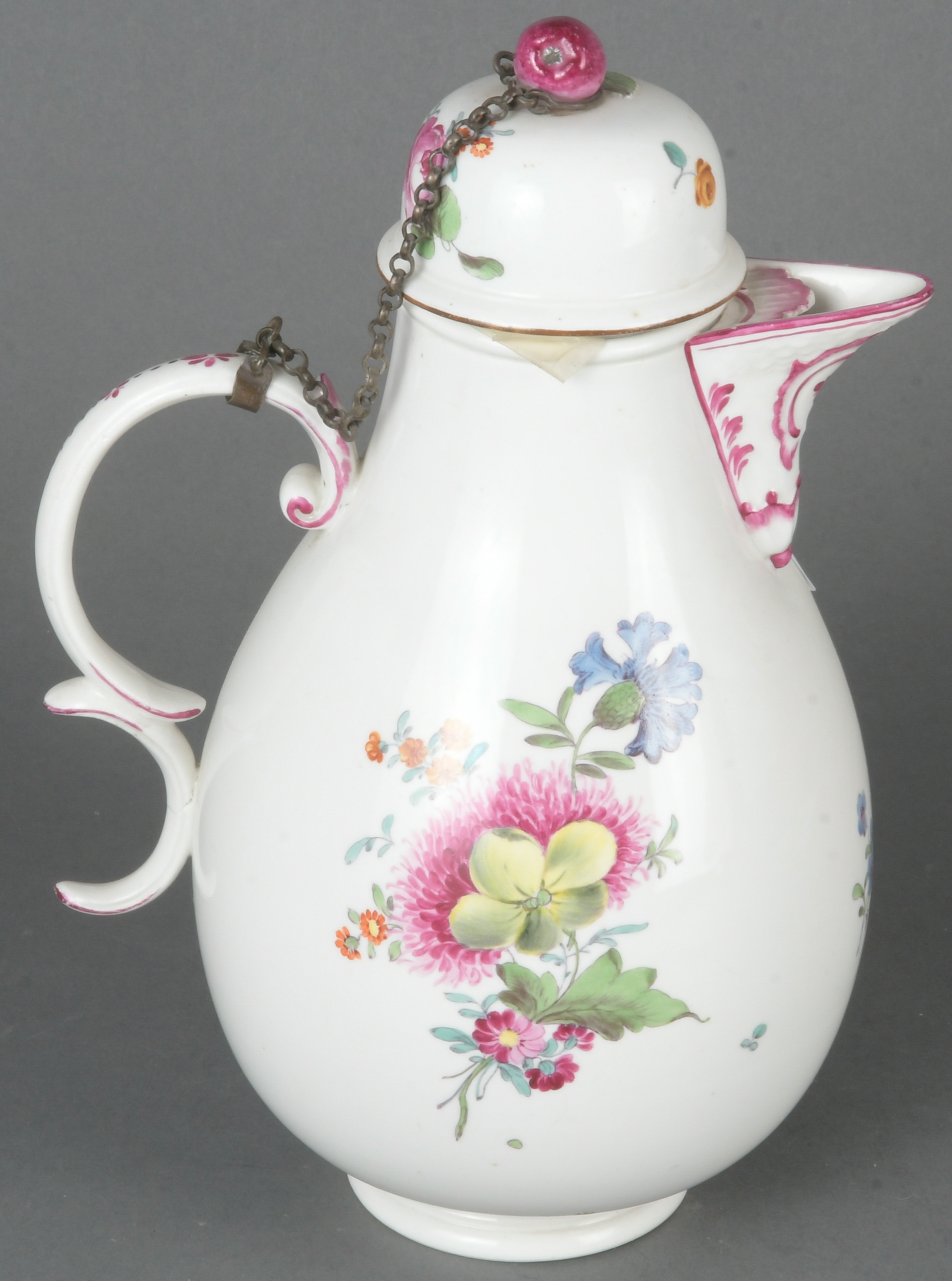 - Katalog-Nr: 1625Kaffeekanne. Höchst 1770. Porzellan, bunt bemalt mit Floraldekor; am Boden unterglasurblaue Radmarke, H=25 cm. Provenienz: Sammlung Bruno Sandner, Hofheim. (Henkel rest.)o.L.