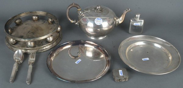 - Katalog-Nr: 1612Konvolut 800er / 925er Silber, ca. 1.890 g, bestehend aus: Flachmann, Pillendose, Teekanne, Teller und Sockel.o.L.