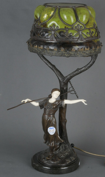 - Katalog-Nr: 1615Hohe Jugendstil-Tischlampe. Österreich um 1900. Marmorsockel mit darauf stehender Bronzebäuerin und pilzförmigem Glasschirm, H=61 cm, D=26 cm. (rest.)o.L.